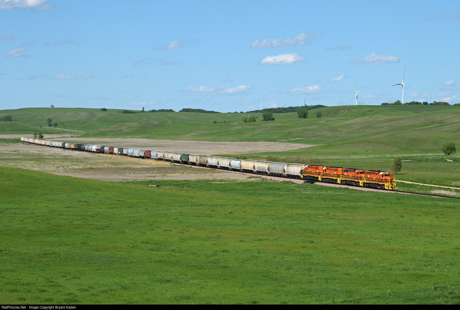 The verdant hills of the Buffalo Ridge observe the passing of a westbound train on the former C&NW line to South Dakota.