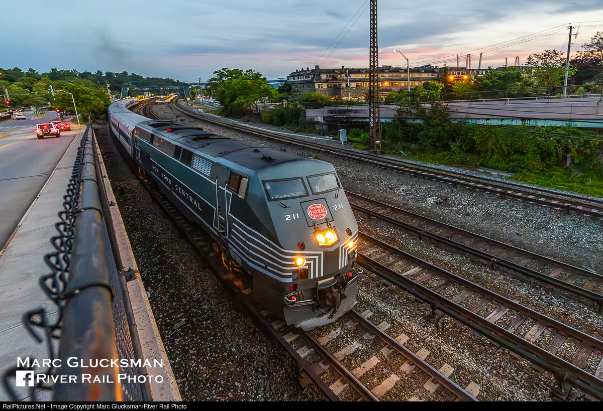 Wrapping Around The Weekend. MTA Metro-North Railroad Train 8855 had the perhaps the most apropos of the 40th Anniversary wraps, P32AC-DM MNCW 211 (New York Central) on the local run to Croton Harmon on the evening of Saturday, June 1, 2024, seen passing through Tarrytown, New York with its former NYC station. The train is passing the new Tappan Zee Bridge in the background with a soft summer sunset.