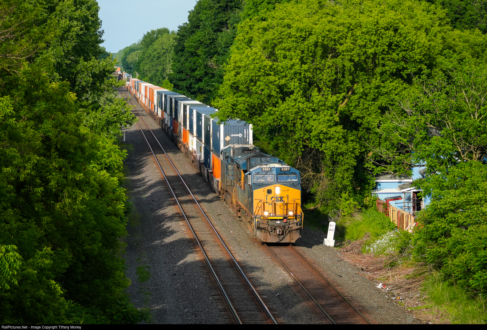 The daily intermodal from Philadelphia to Chicago passes the New York Central mile post 300 after work at Dewitt Yard.