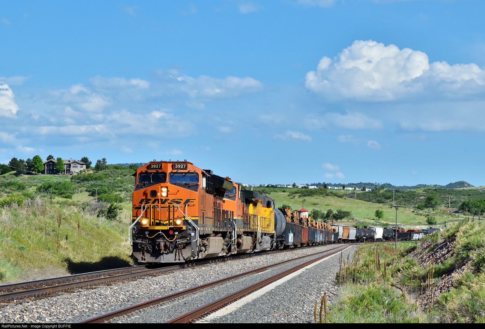 | BNSF 3927 (ET44C4) leads a freight with a Union Pacific motor in the consist as it heads north on the Joint Line through Sedalia, Colorado.
