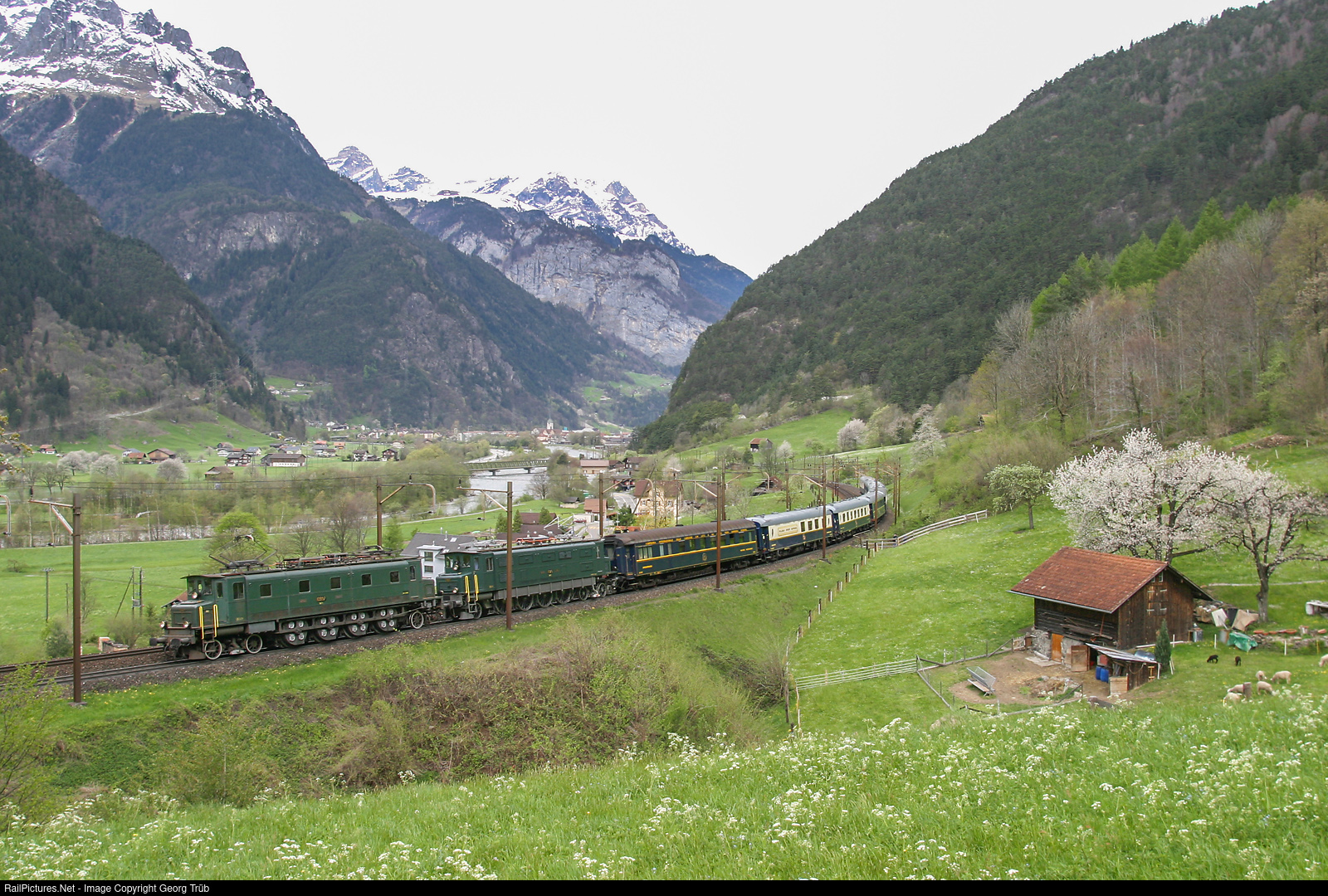 Charter train with wonderful vintage cars of the "Pullman Orient-Express" (CIWLT, International car company) from France, on the Gotthard line. Pulling are two former SBB Gotthard locomotives, now both in private hands: Ae 4/7 # 10997, built 1933 and based in Mendrisio (Club San Gottardo) and # 11026, built in 1934 and based in Brugg AG (Association Mikado 1244). The train had 7 Pullman parlor cars "WSP" and dining cars of the SNCF, and in front the dining car WR # 2749, which is now with steam group Zürich. The Ae 4/7 # 10997 is owned by Swisstrain nowadays in Payerne. The train from Winterthur via Zürich-Othmarsingen-Wohlen-Arth Goldau to Bellinzona-Lugano and Mendrisio, just started the ascent from Erstfeld over the Gotthard north ramp towards Amsteg-Silenen.