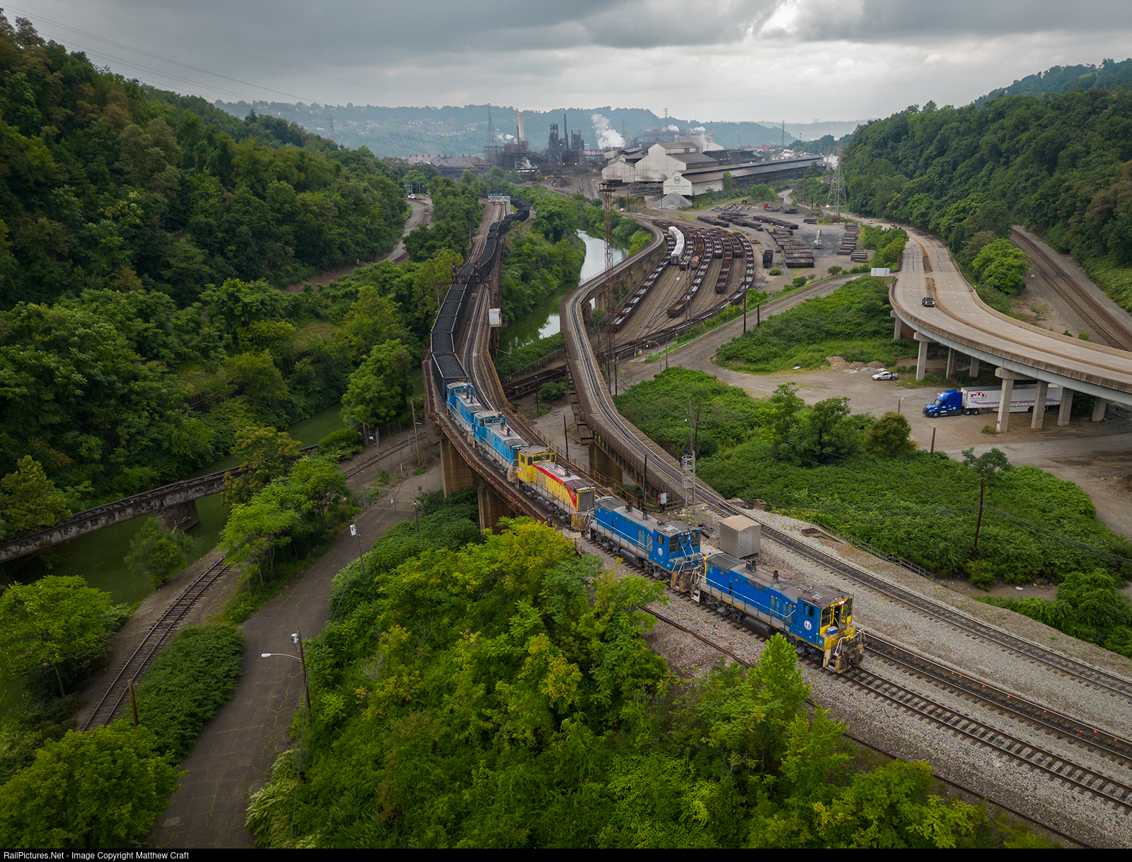 An August thunderstorm approaches as a five-pack of URR switchers reverse a long cut of loaded coke cars down the ramp into Edgar Thomson's Dexter Yard. The Valley Yard is packed with fresh steel slabs that are waiting to be picked up and interchanged with NS/CSX.