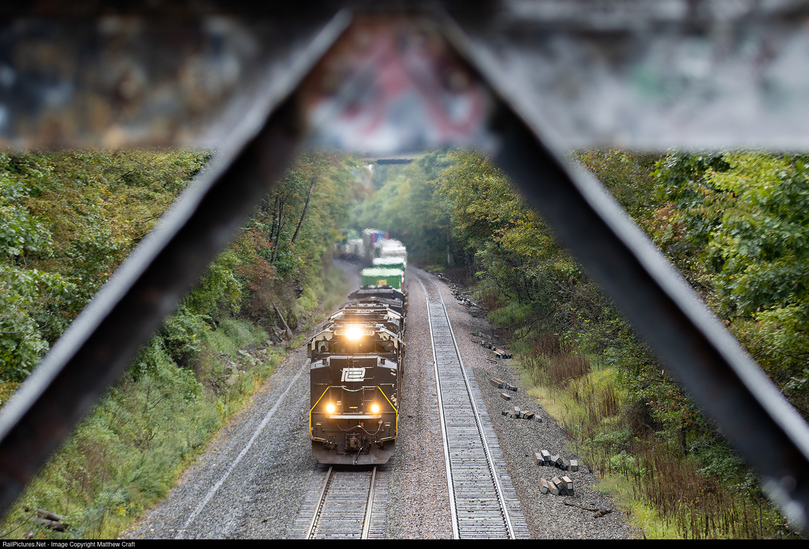 NS 1073 roars around the bend on a rainy October day, passing underneath a bridge that no longer exists. The Buffenmeyer Road Bridge had long been closed to traffic, but made for an excellent photography platform, but NS removed it entirely last year.