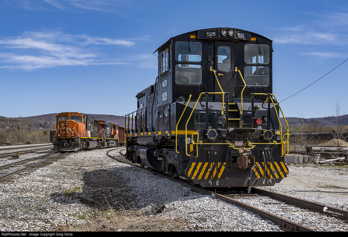 On April 23rd, 2024, New England Central Railroad (NECR) EMD SW1500 #1525 (former SOU, NS, PIR, CSOR & NECR 2340) sits dormant in the sun, awaiting an uncertain future, while Canadian National EMD SD75I (GF-643a) #5659 prepares to lead Train 323 back towards Canada at Italy Yard in Saint Albans, Vermont.