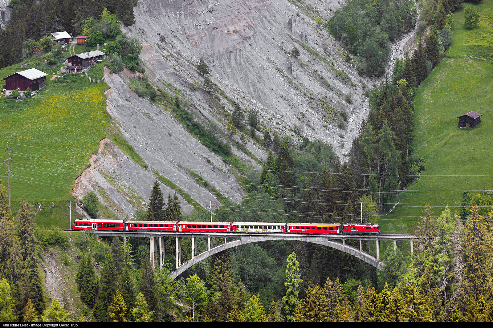 Last October, the Rhaetian Railway parked the 6 ABe 4/4 # 51 to # 56 railcars on the Bernina line. As a result, during the summer half-year, when the various Bernina Express trains are running, there is now an average shortage of around 2 “Allegra” dual-current railcars (ZTZ) to cover all services, especially on the Bernina and to Arosa. For this reason, push-pull trains with Ge 4/4 IIs are now used between Chur and Arosa, and freight trains are also operated with two Ge 4/4 IIs. Ge 4/4 II # 632 pulls the regional train 1437 of the line R16 from Chur to Arosa, crossing the 145 meter long and 46 meter high Gründjitobel viaduct between Peist and Langwies. The viaduct in reinforced concrete has a main span of 85 meter and was built in 1913/1914 for the then independent Chur-Arosa Railway (ChA).