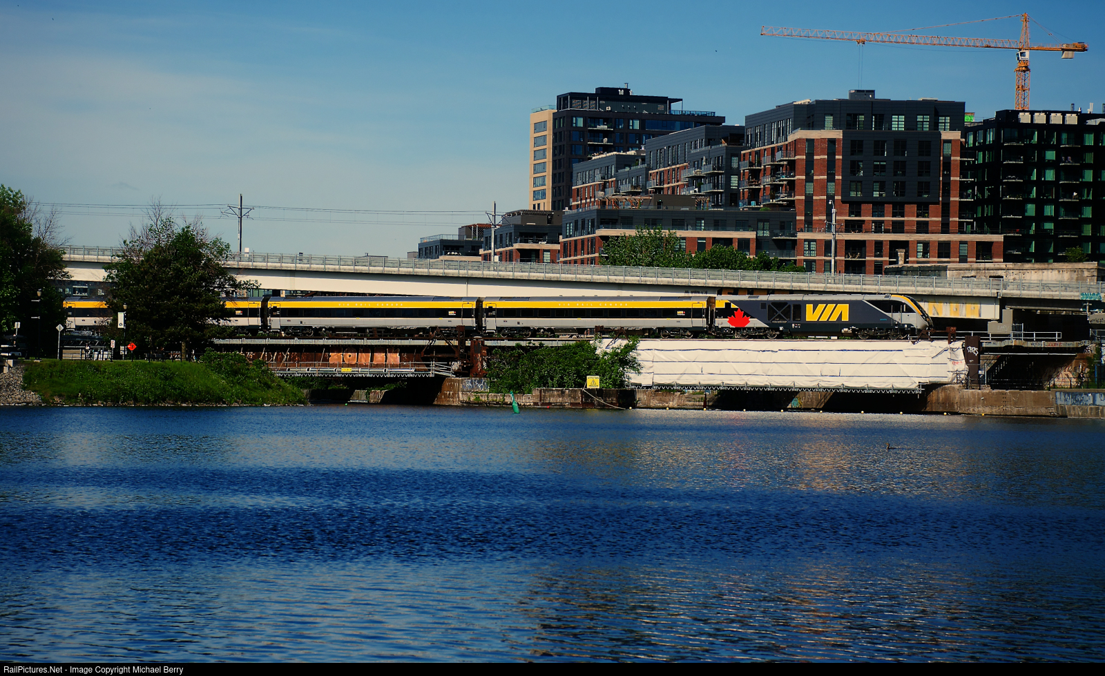 VIA 2211 leads VIA 33 over the Lachine Canal as it approaches Central Station.