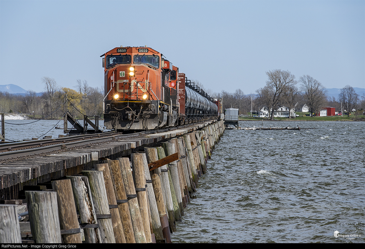 On April, 23rd, 2024, Canadian National EMD SD75I (GF-643a) #5659 leads Train 323 across the East Alburgh Trestle on the NECR Swanton Subdivision in Alburg, Vermont. The train is on its way to back to Taschereau Yard in Montreal, QC, Canada after picking up cars at Italy Yard in Saint Albans, Vermont.