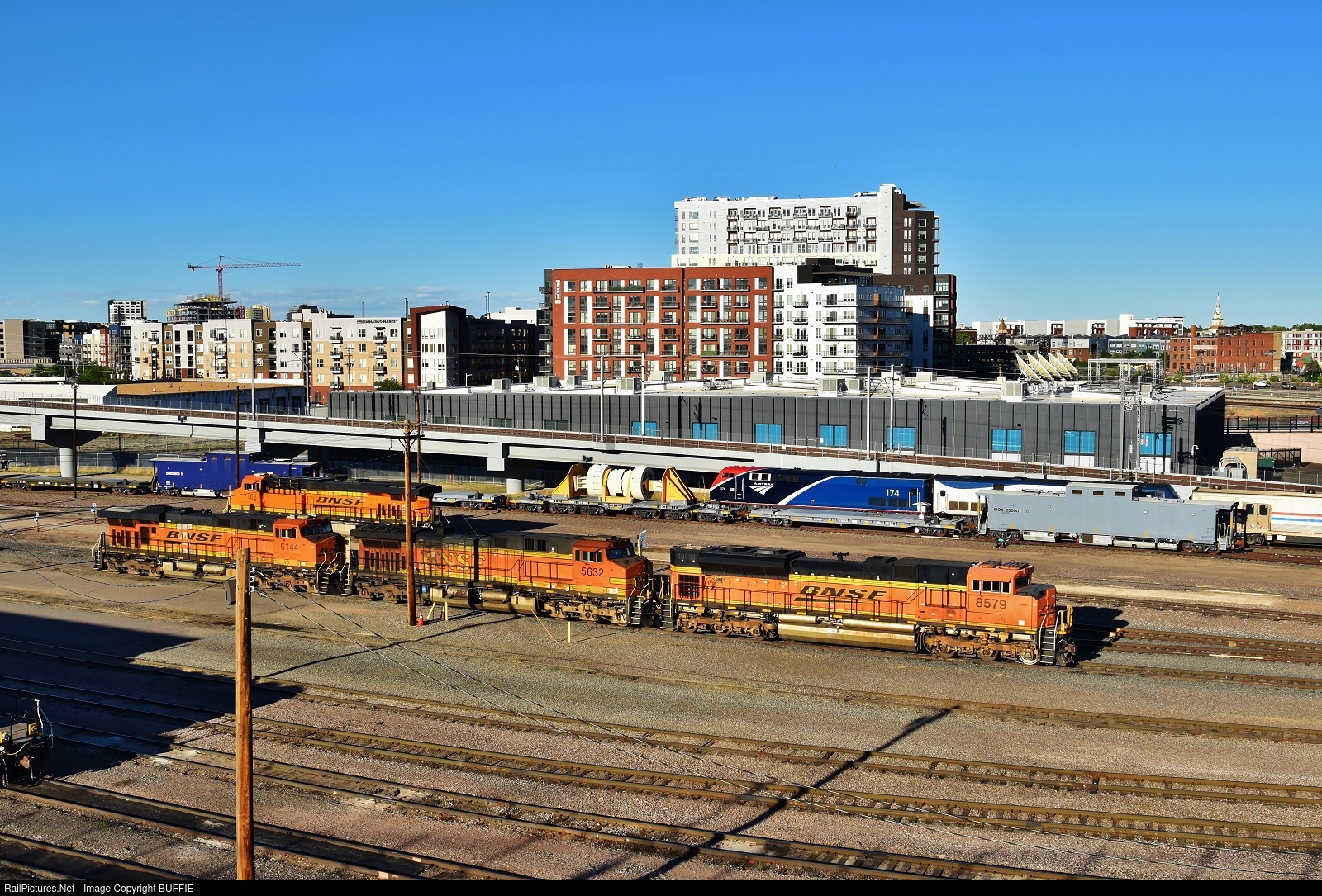There is a lot to see in this picture of the yard at the BNSF Denver engine servicing facility, including an ACe BNSF 8579, two armored cabooses of the Department of Energy, a special container vessel for spend radioactive fuel rods, and the California Zephyr's Phase VII engine backing into Denver Union Station.