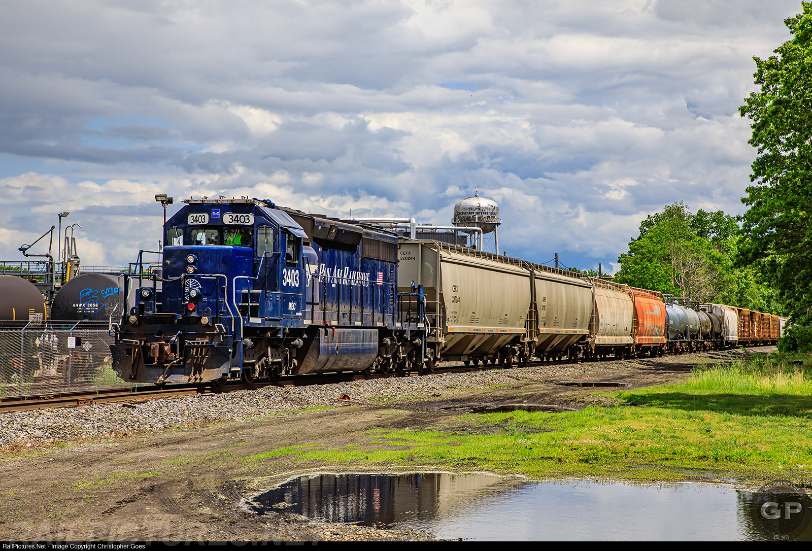 MEC 3403 leads RJ-1 as it waits for RJED to clear up in the yard before proceeding with Schenectady International Chemical Plant & water tower as a backdrop.