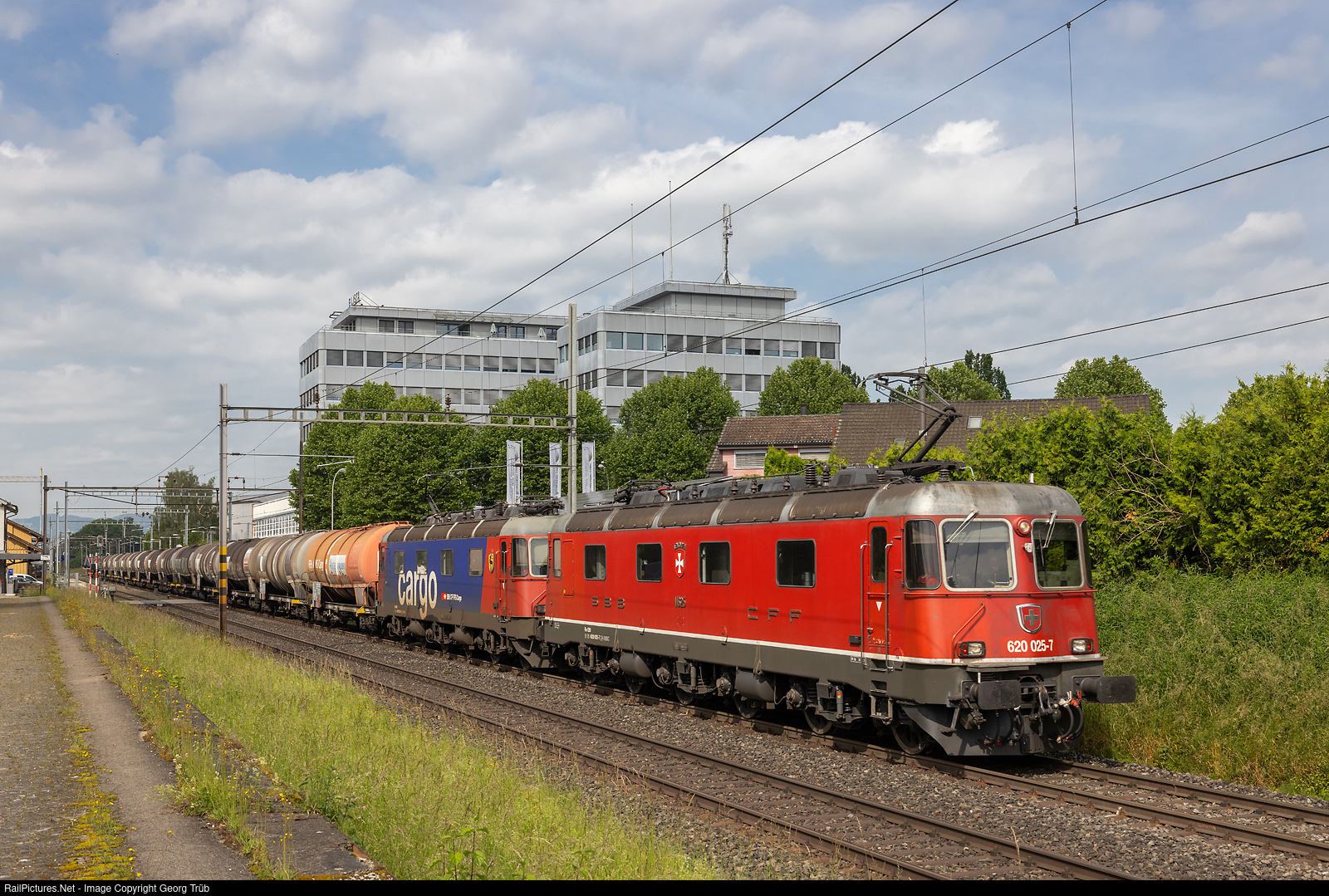 | Re 620 # 025 and # 063 (Re 6/6 # 11625 and # 11663) of the SBB in multiple control pull the loaded fuel oil train 69744 from the Limmattal shunting yard (RBL) via Kloten-Winterthur-Romanshorn VL to St.Gallen Haggen through Erlen. |