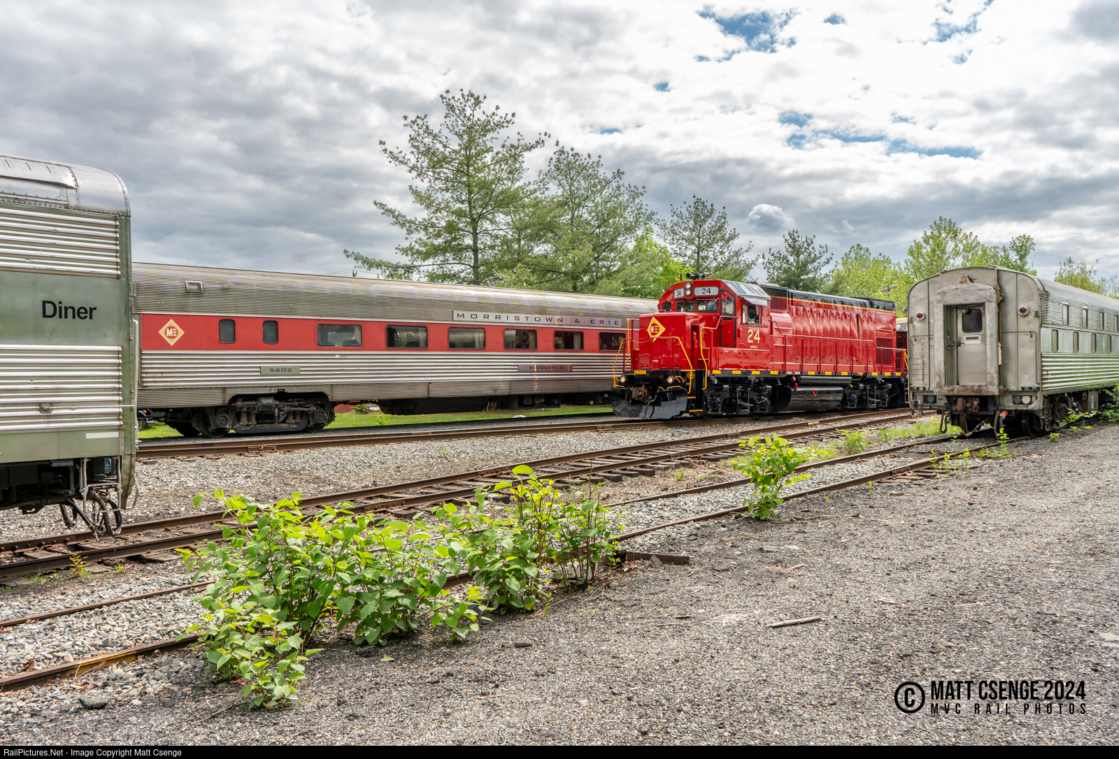 Morristown & Erie GP15-1 no. 24 creeps through the yard at the Whippany Railway Museum, where numerous railcars are stored. In the background is Morristown & Erie no. 5602 Ridgedale, at left is former Santa Fe diner Epicurus, and at right is former Northern Pacific slumbercoach Loch Ness. |