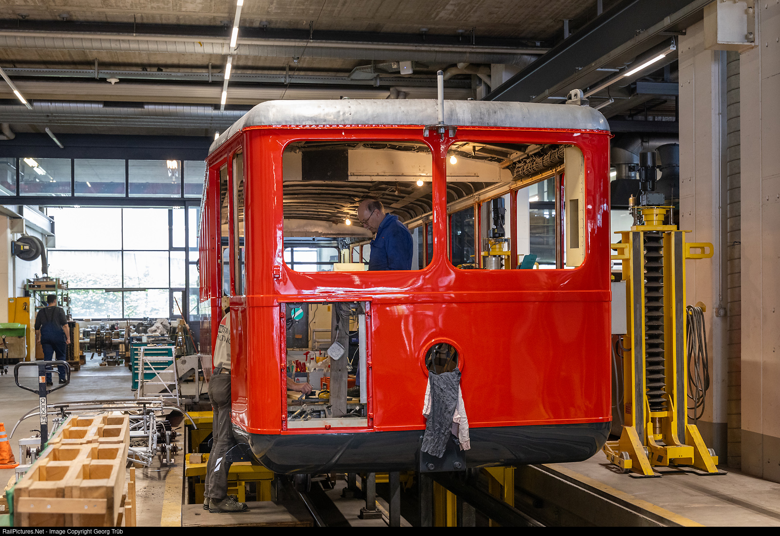 The Rigi Railways cogwheel railcar Bhe 2/4 # 1, built in 1937 for the Vitznau-Rigi Railway when it was electrified, is being extensively renovated this year and can be seen in the workshop in Vitznau. Corrosion restoration, partial sheet metal replacement, wood renewal, newly upholstered benches and repainting in the original red are the most important works.