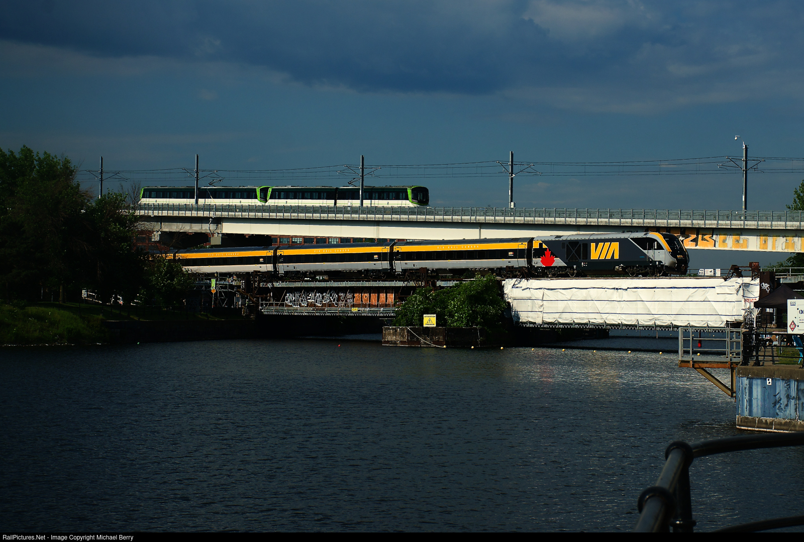 VIA 33 is crossing the Lachine Canal as an REM train passes overhead.