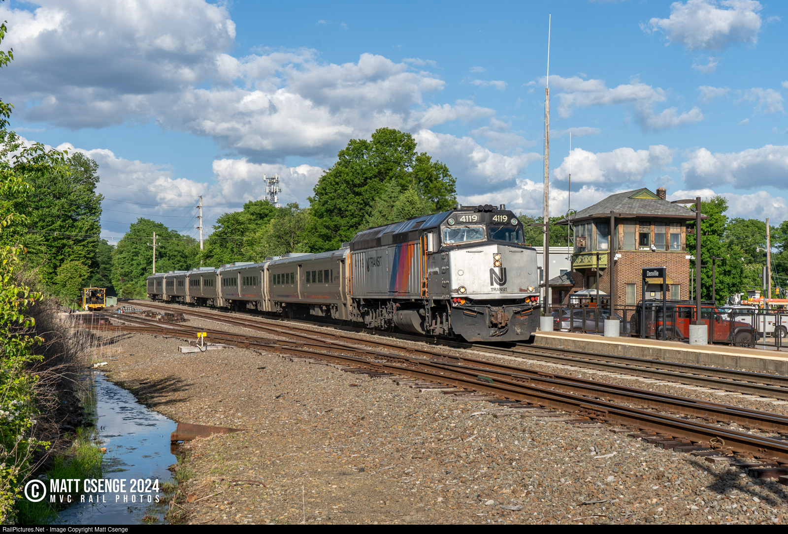NJ Transit F40PH-2CAT no. 4119 is seen leading Montclair-Boonton Line train 1079 into Denville Station, en route to Dover. The historic tower still stands - set back from the platform as a track once existed between the two - but as of yet has not been added to any register of historic places. |