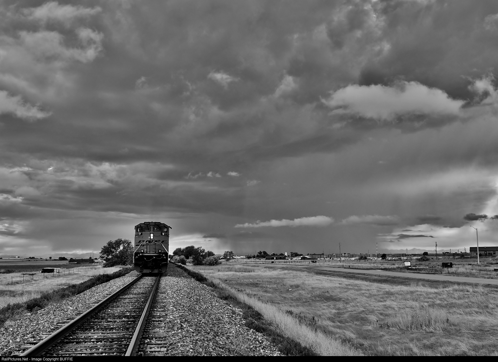 BNSF 9264 (SD70ACe) shoves a loaded coal train towards storm clouds as the train runs west on the Brush Sub through Keenesburg, Colorado.