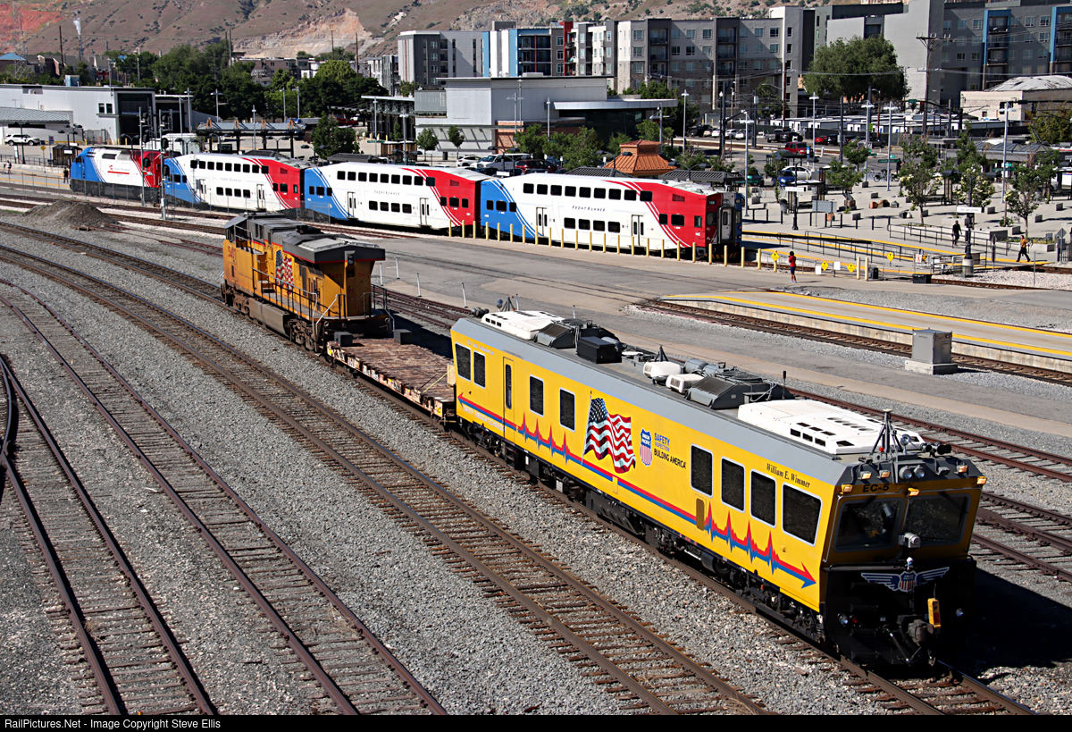 | I actually was trying to catch another train. When this track inspection train with EC-5 and 5407 came onto the scene. Front Runner number 6 also decided to get in on the picture. 6 is painted in commemoration of 15 years of Front Runner. |
