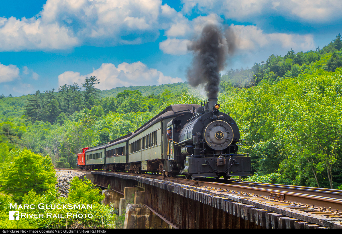 Flagg over Jericho. On Sunday June 10, 2012, the Railroad Museum of New England hosted visiting 0-4-0ST Flagg Coal 75 (née-Flagg Coal Company 2, Vulcan Iron Works, 1930). The train is crossing Jericho Bridge over the Naugatuck River on the return to the Thomaston Station. During this era, the steam engine traveled extensively across the eastern United States by road truck from place to place make appearances at different railroads and museums before its mandated 15-year rebuild in 2016.