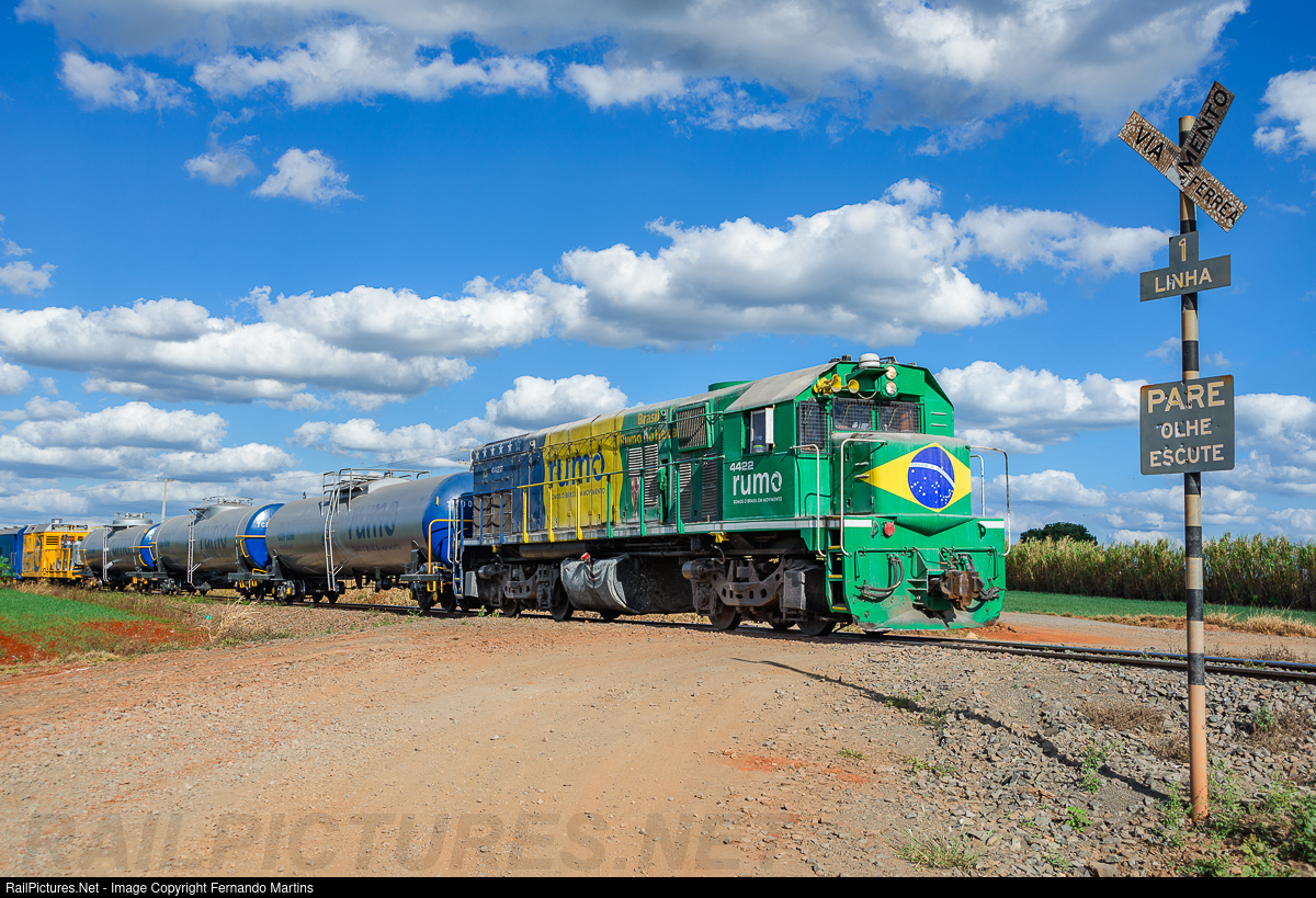 In Marialva, EMD G22U No. 4422 is leading the W76, a Rumo Logística weed sprayer train. This train will continue its application until it reaches the Maringá yard.