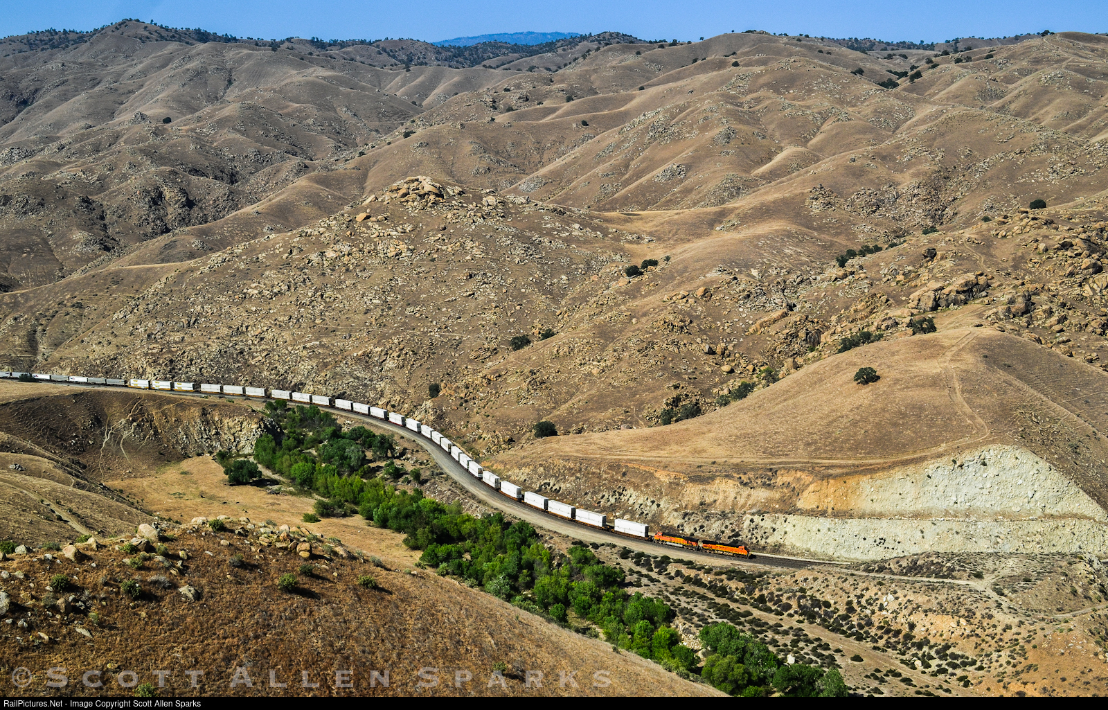 | A bone dry golden hilled landscape, along with a saturated green creek bed, creates a perfect contrast and scene for a short BNSF intermodal to quickly twist its way up through one of the most secluded sections in the lower Tehachapi foothills. |
