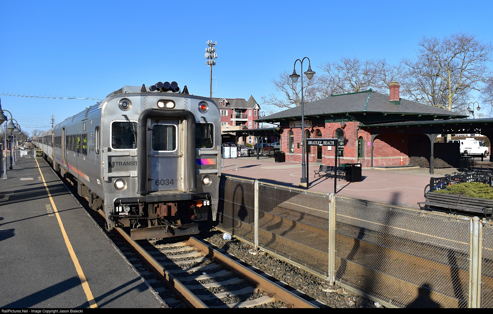| A train pulling in to Bradley Beach station. The current station depot was built in 1912 for the Central Railroad of New Jersey, and has been on the state and federal registers of historic places since 1984. |