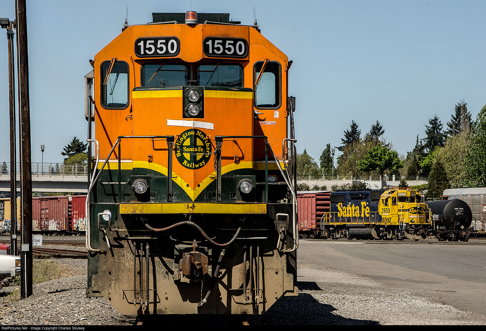 VANCOUVER WA April 24 2013 — BNSF SD9 1550 shows off its new cab and chopped nose. EMD built the unit (b/n 19340) in February 1954 for Great Northern Railway as GN 573. An April 13, 2022, Trains Magazine article by Steve Glischinski records, “No. 573 worked for many years in Superior, Wis. on the GN ore docks and in ore transfer service. It became Burlington Northern No. 6100 when that railroad was formed in March 1970, and later worked for BN in the Twin Cities area. After BNSF Railway was formed in 1995, No. 6100 was selected for a rebuild program to upgrade it with modern components. It was remanufactured in December 1998 by rebuilder VMV with new electronics, an upgraded engine, air conditioning, and a new cab. It also had its high nose chopped down to allow better visibility. In 2006 it was renumbered BNSF 1710, then in 2009 was renumbered again to BNSF 1550.” BNSF has donated the unit to the Lake Superior Railroad Museum in Duluth, Minn.” (Photo by Charles Stookey)