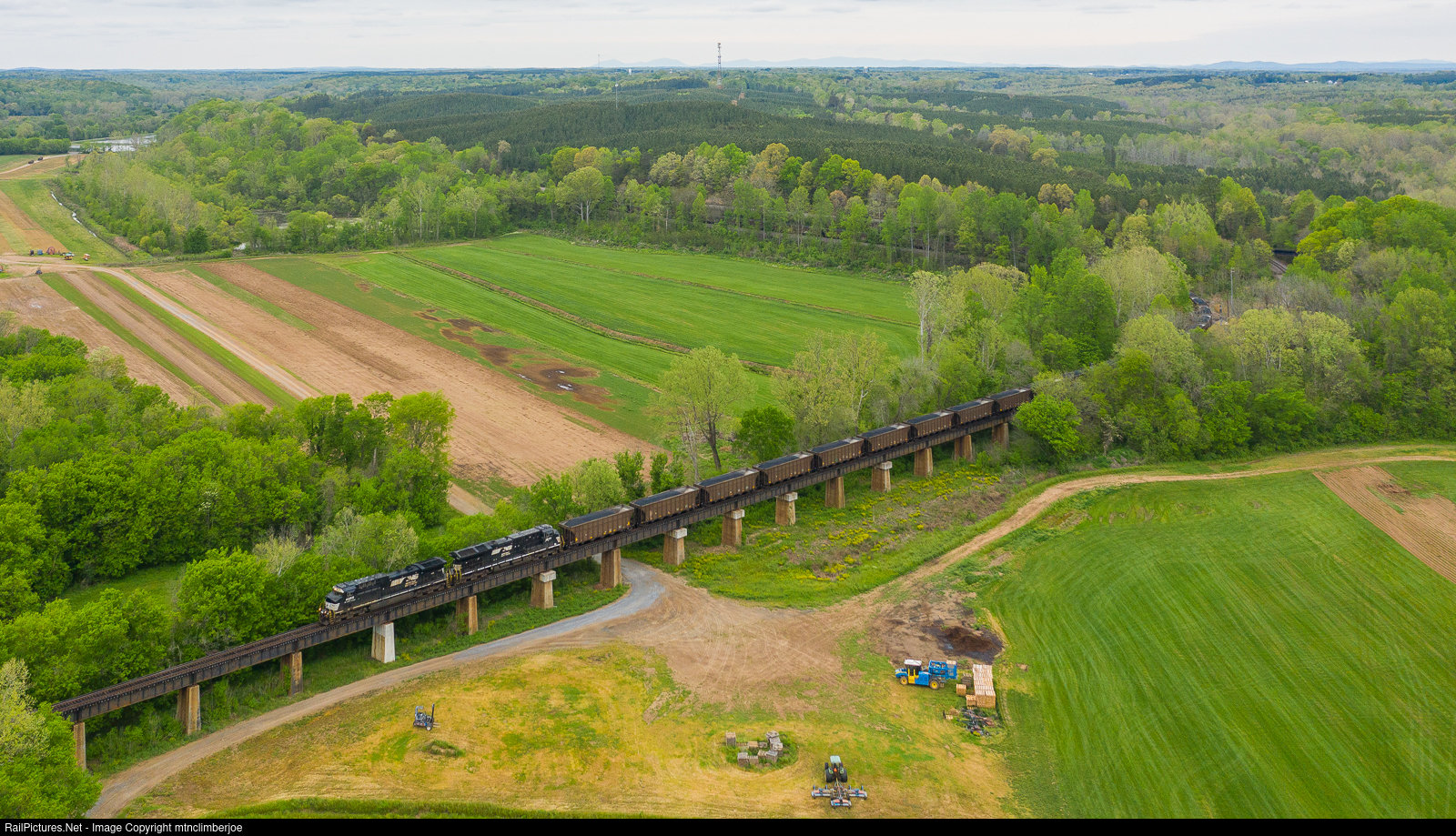 | A pair of GE's lead loaded Norfolk Southern coal train 778 as it crosses the floodplain of the Staunton River and heads towards the main span. The train is slowly rolling through the junction at the Patrick Henry control point and descends on the connection from the Altavista District on to the Durham District. |