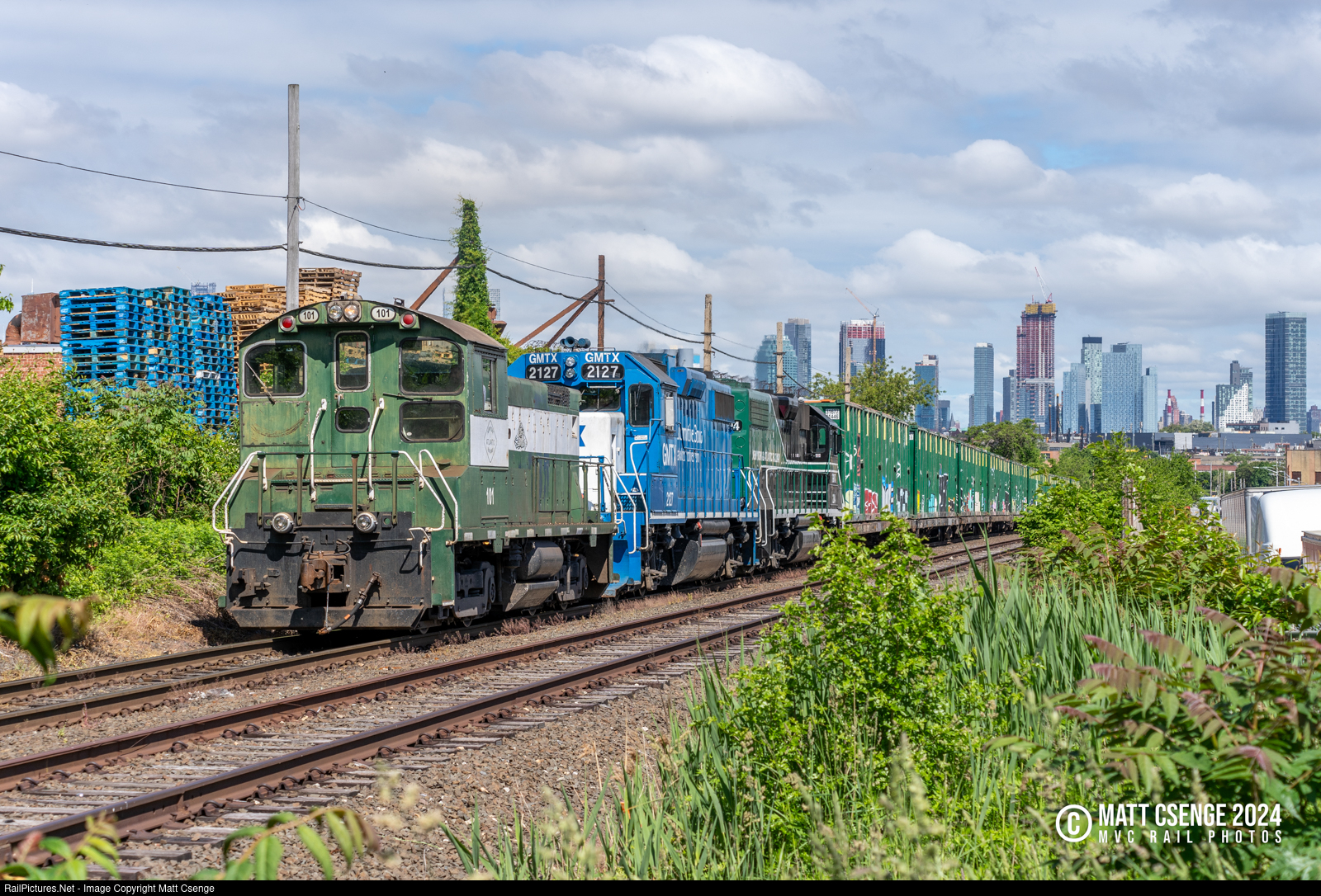 New York & Atlantic SW1001 no. 101 (EMD, 1977) is seen leading train RS-40 down the Lower Montauk Branch, approaching the bridge at Flushing Ave. The skyline in the background is not Manhattan, but rather Long Island City, Queens, which in recent years has been living up to the New York State motto, "Excelsior," Latin for "Ever Upward."