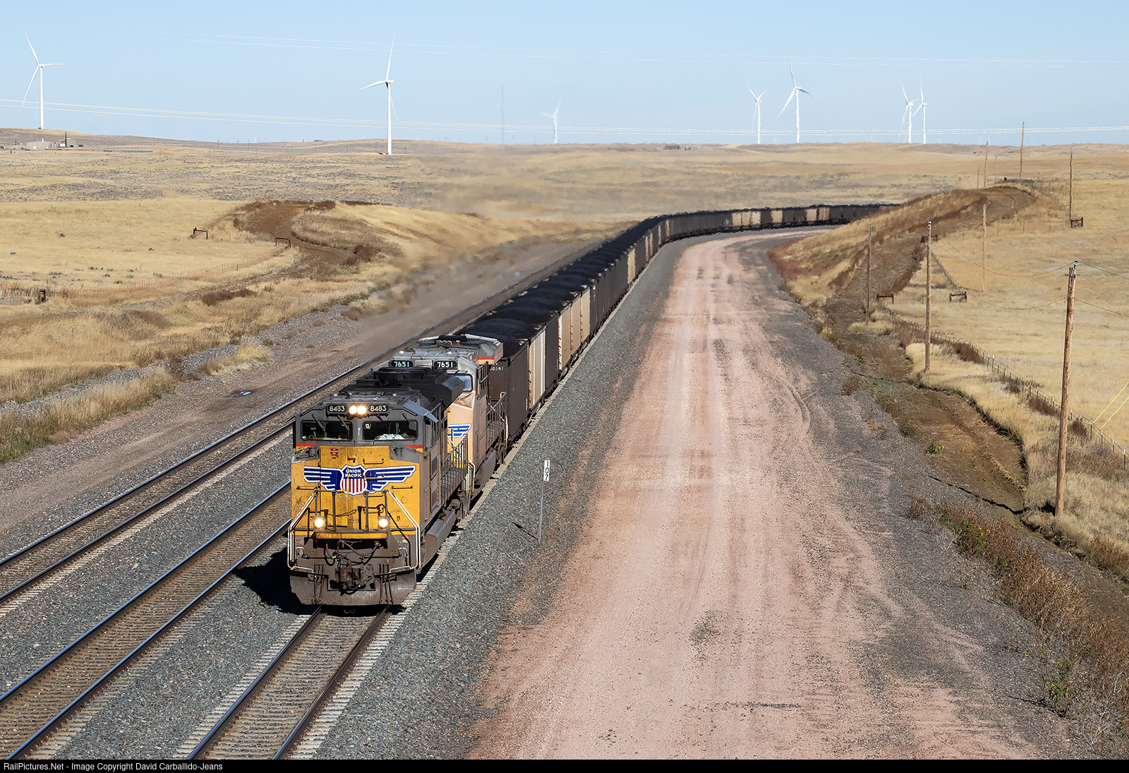 | A Union Pacific loaded coal train slowly traverses over the undulating territory of the Powder River Basin between Bill and Douglas, WY. |