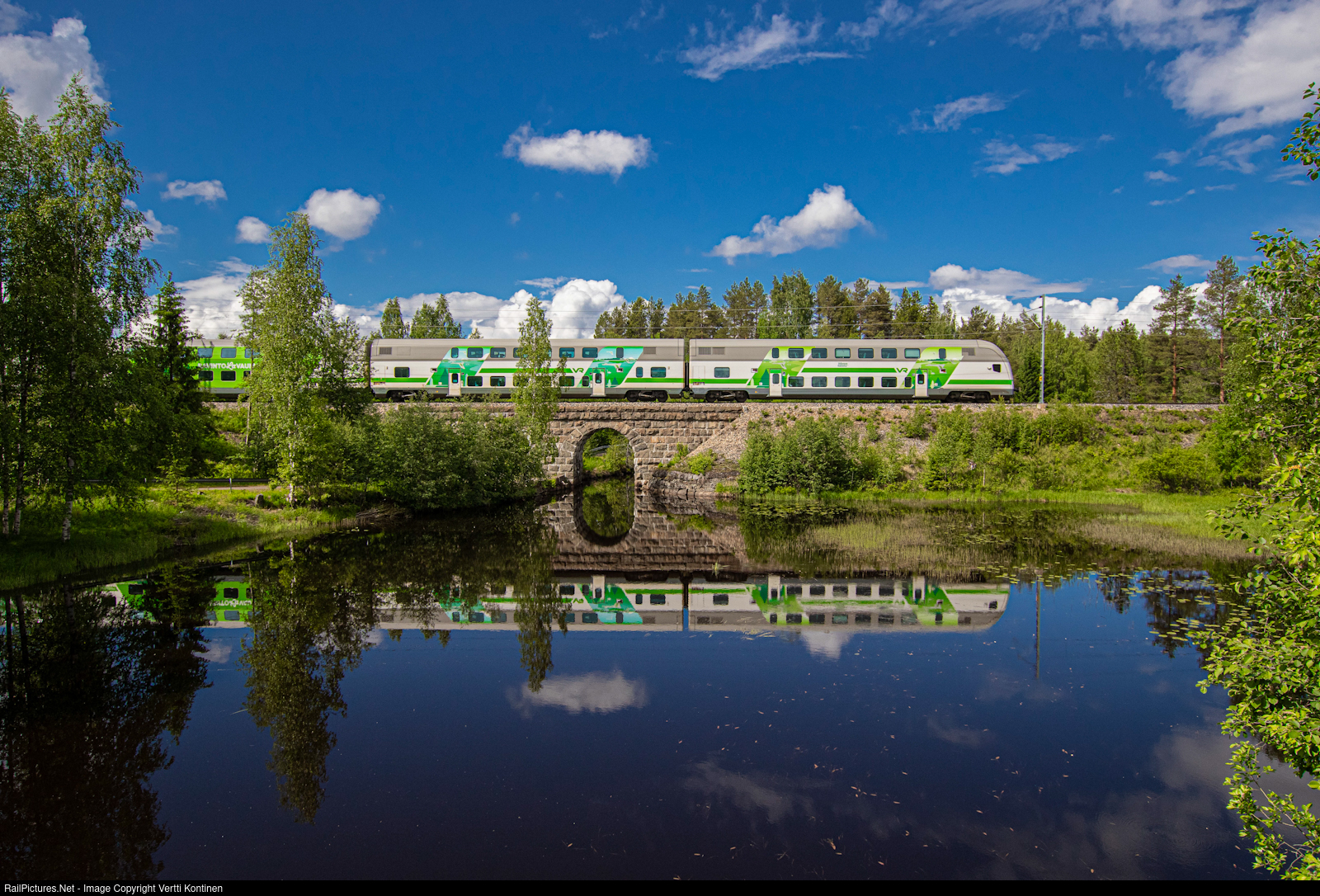 | VR IC 63 service from Helsinki to Oulu that runs via Savo line instead of the Finnish mainline seen here crossing an old stone arch bridge in Jormua between Kajaani and Kontiomäki |