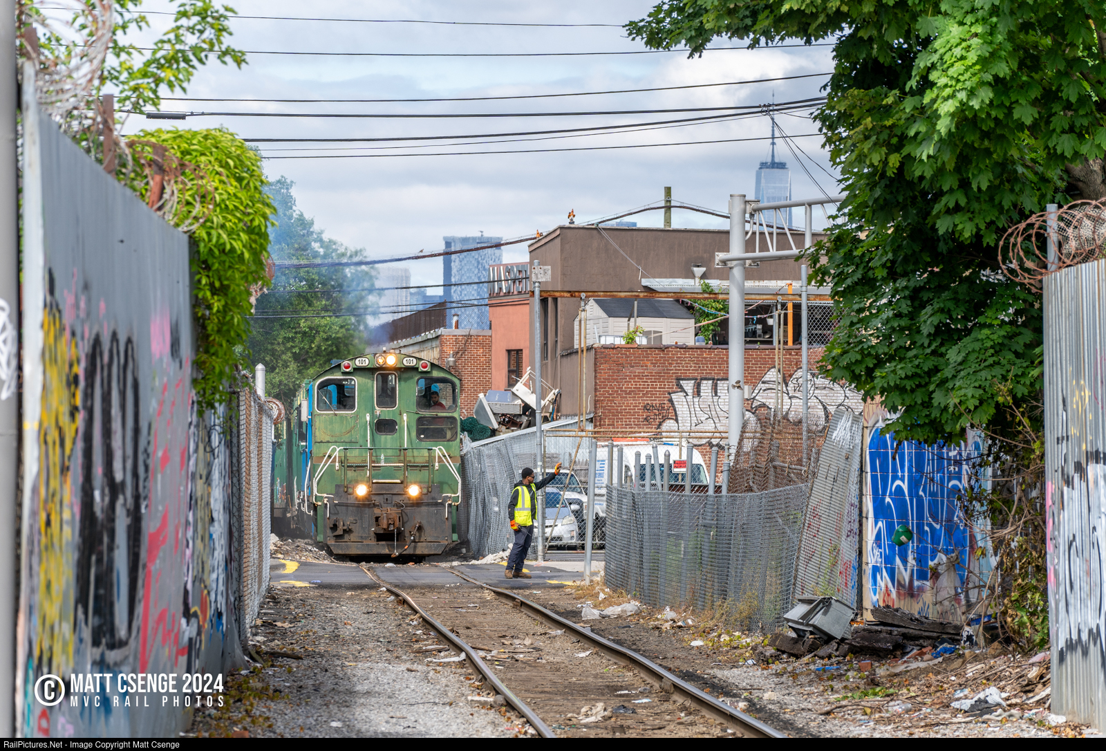 The conductor of New York & Atlantic Railway train RS-40 is seen halting traffic on 55th St as SW1001 no. 101 creeps towards the roadway through the dense urban neighborhood of Maspeth, Queens. |