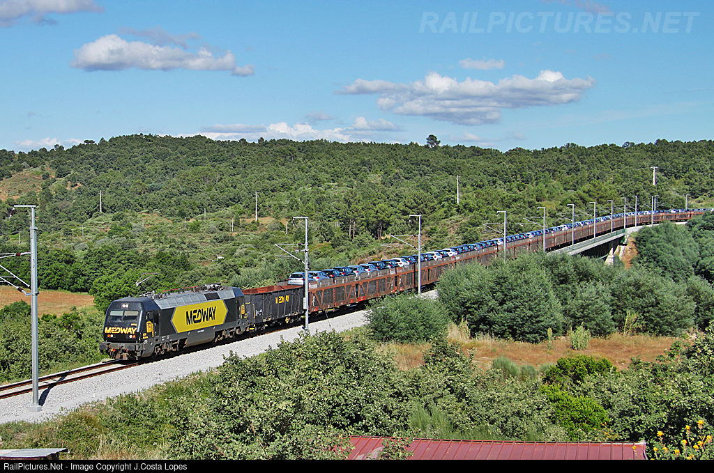 | A chartered Medway train, 98204, transport of cars Seat/Cupra, from Vilar Formoso to Praias do Sado, pulled by Siemens locomotive 5630.