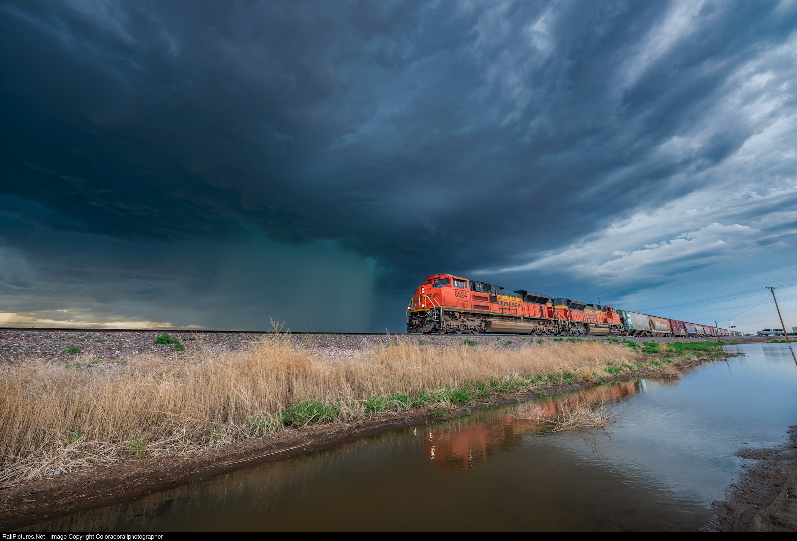Severe warned supercell A6 tracking ENE at 17kts with 2.75” hail and 65 mph winds is approaching from the north, northwest into Wiggins, CO on Monday June 10, 2024 at 17:20. Westbound H LAUDEN9 05 with BNSF 8524 rolls in earnest for Crest to wait out the weather. |