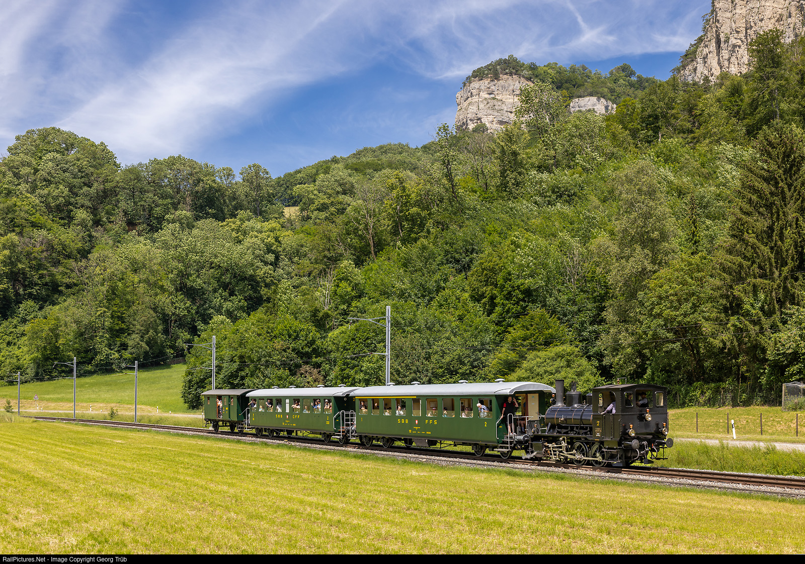 The Oensingen-Balsthal Railway (OeBB) celebrated its 125th anniversary on the weekend of June 15/16, 2024. On this occasion, several special trains free for the public circulated between Balsthal and Oensingen and vice versa. Steamlocomotive E 3/3 # 2, built by SLM in 1899, pulls a train with cars of the association Historic Seethalbahn (HSTB) between Klus and Oensingen.