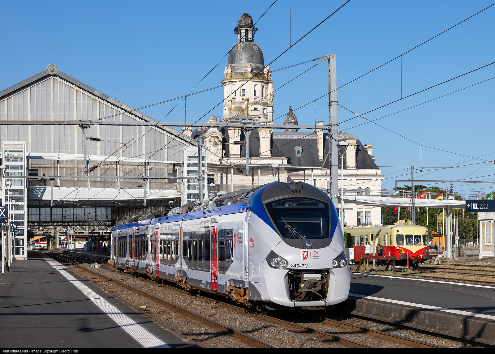 | "Alstom Coradia Polyvalent" articulated bimodal train Z 84 # 647 of the SNCF Region Nouvelle-Aquitaine is leaving La Rochelle-Ville with a train of the line L16 from Angoulême via Cognac-Saintes-Rochefort to La Rochelle-Porte Dauphine. This train with 4 MAN diesel motors with 340 kW each and capable to run with 25000 V 50 Hz AC and 1500 V DC are now built by CAF. On the right is the diesel railcar X # 2403 of the association Chemins de Fer de la Haute Auvergne, which made a visit with a journey of the swiss SERVRAIL. |