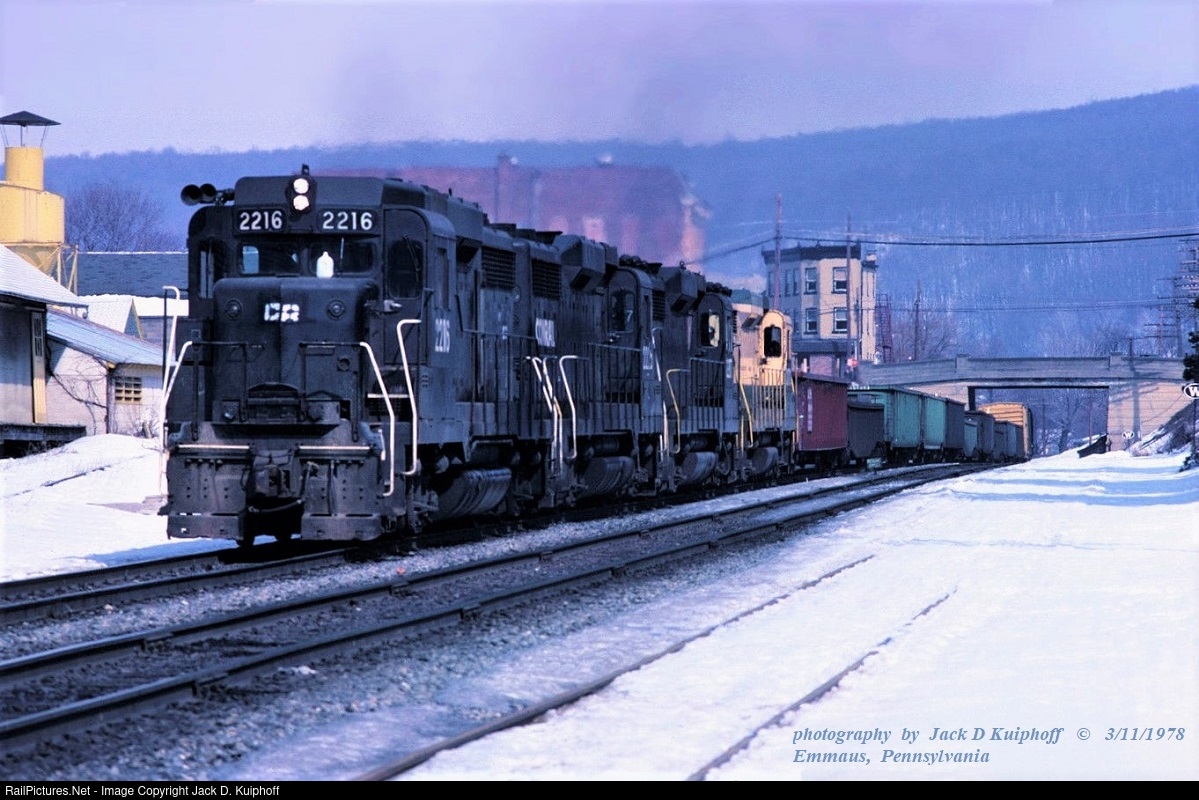 | Conrail, CR, GP30's 2216-2225-2217-2170, with westbound APB-1 on the ex-Reading Line at, Emmaus, Pennsylvania. March 11, 1978. Jack D Kuiphoff © photo |