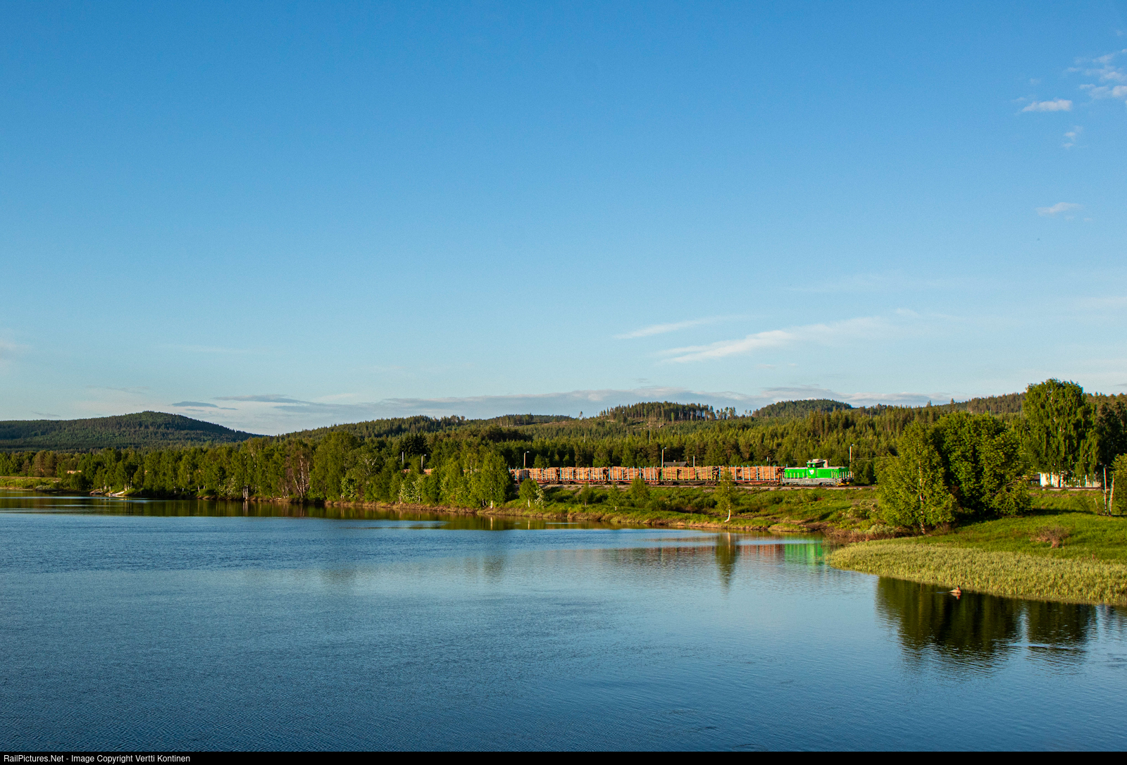 | VR Dr19 2838 hauling a loaded timber train southbound on the Kolari line. The train has just crossed the arctic circle and is seen here running along Tornio river im golden light |
