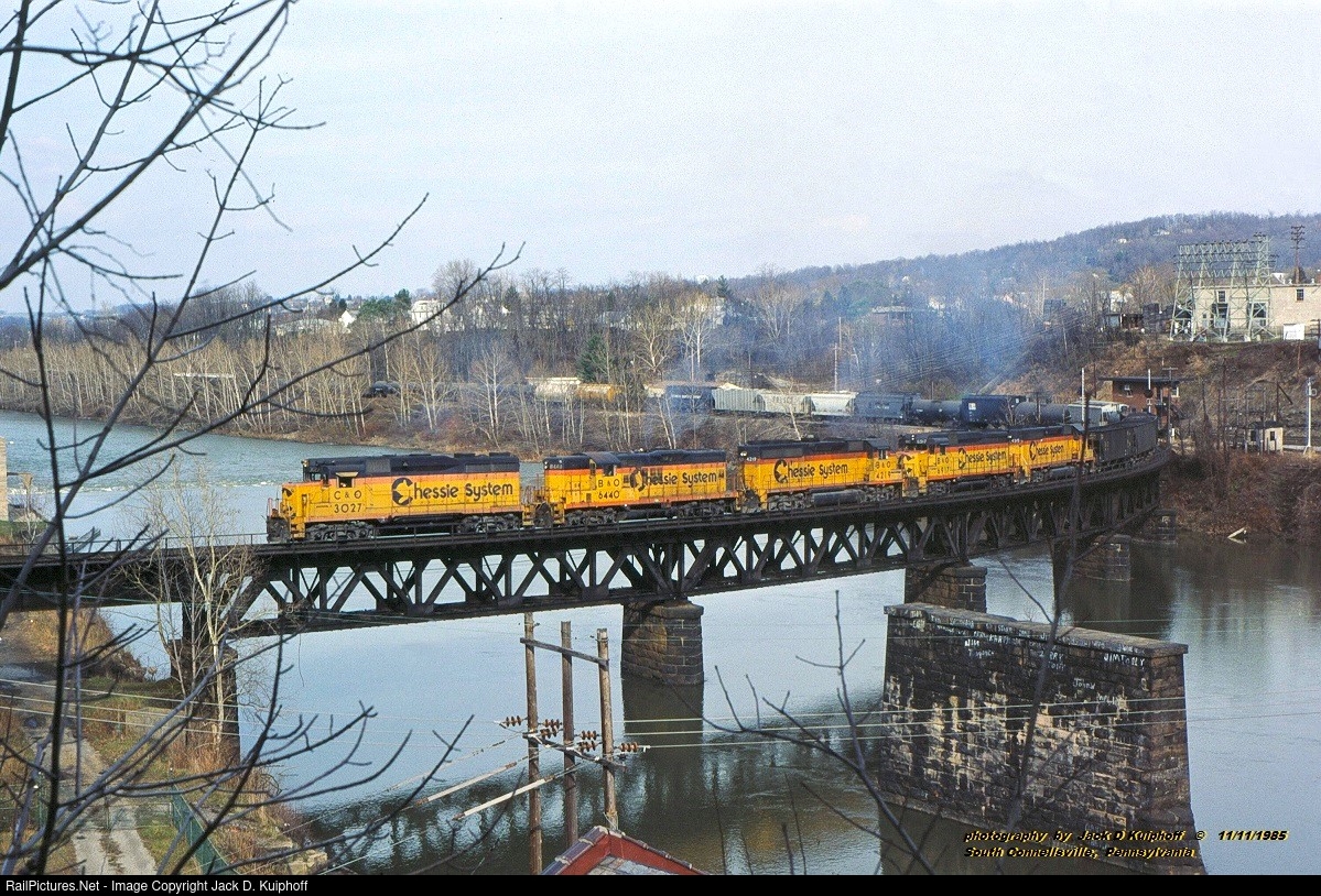 Chessie, C&O GP30 3027 leads Chessie GP9 6440, GP40-2 4219, GP30 6917, GP40-2 4215, with the Skinner across the Youghiogheny River at South Connellsville, Pennsylvania. November 11, 1985. Jack D Kuiphoff © photo