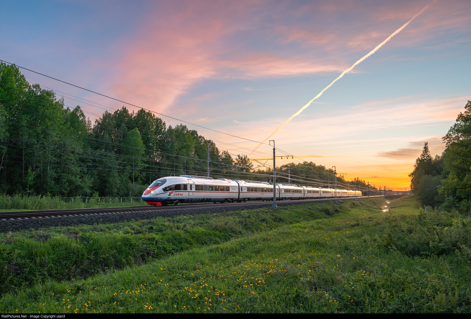 The high-speed train "Sapsan" is going from Saint-Petersburg to Moscow.