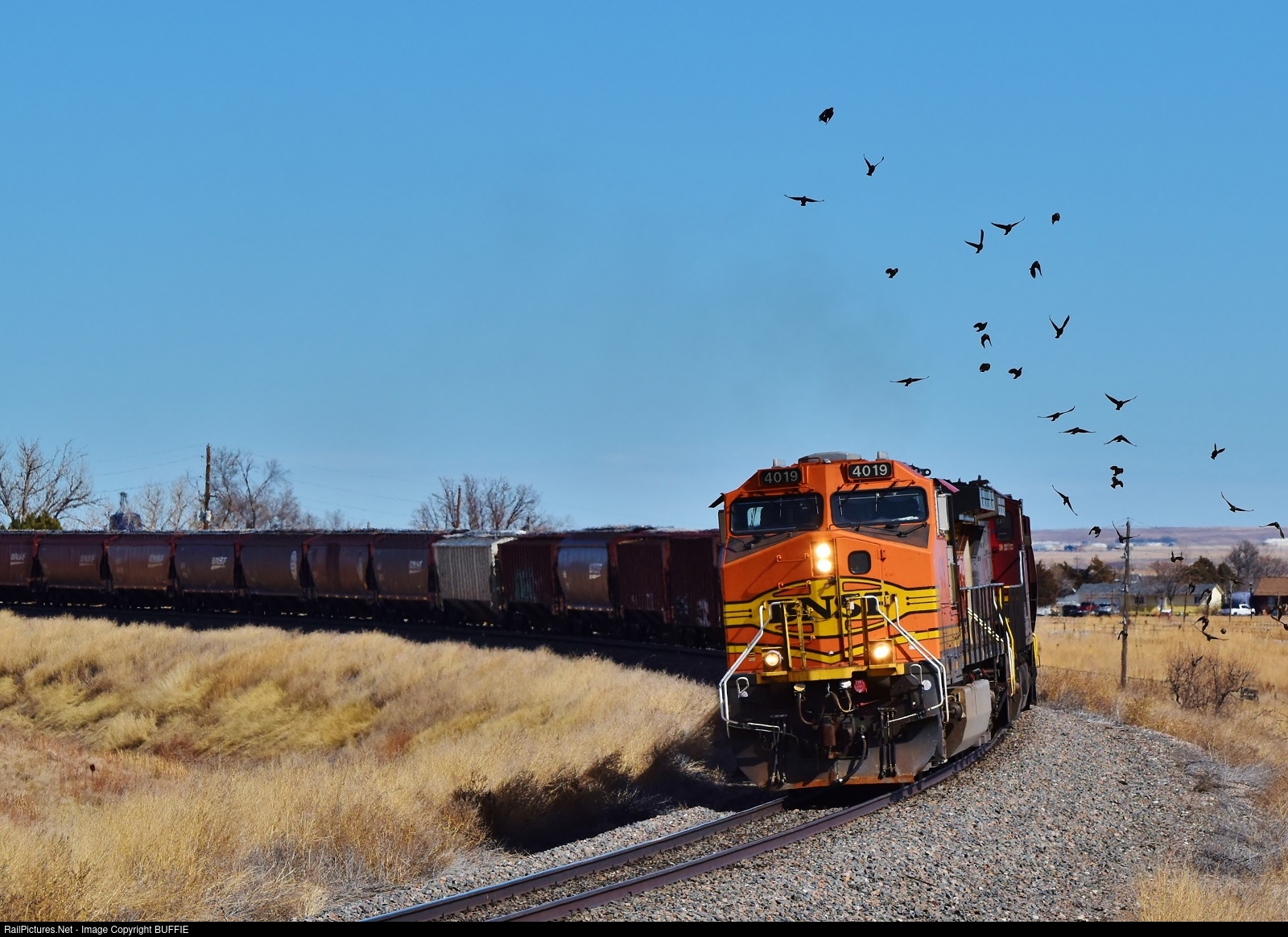 BNSF 4019 (Dash9) rousts a flock of birds as it runs through a curve in Keenesburg, Colorado.