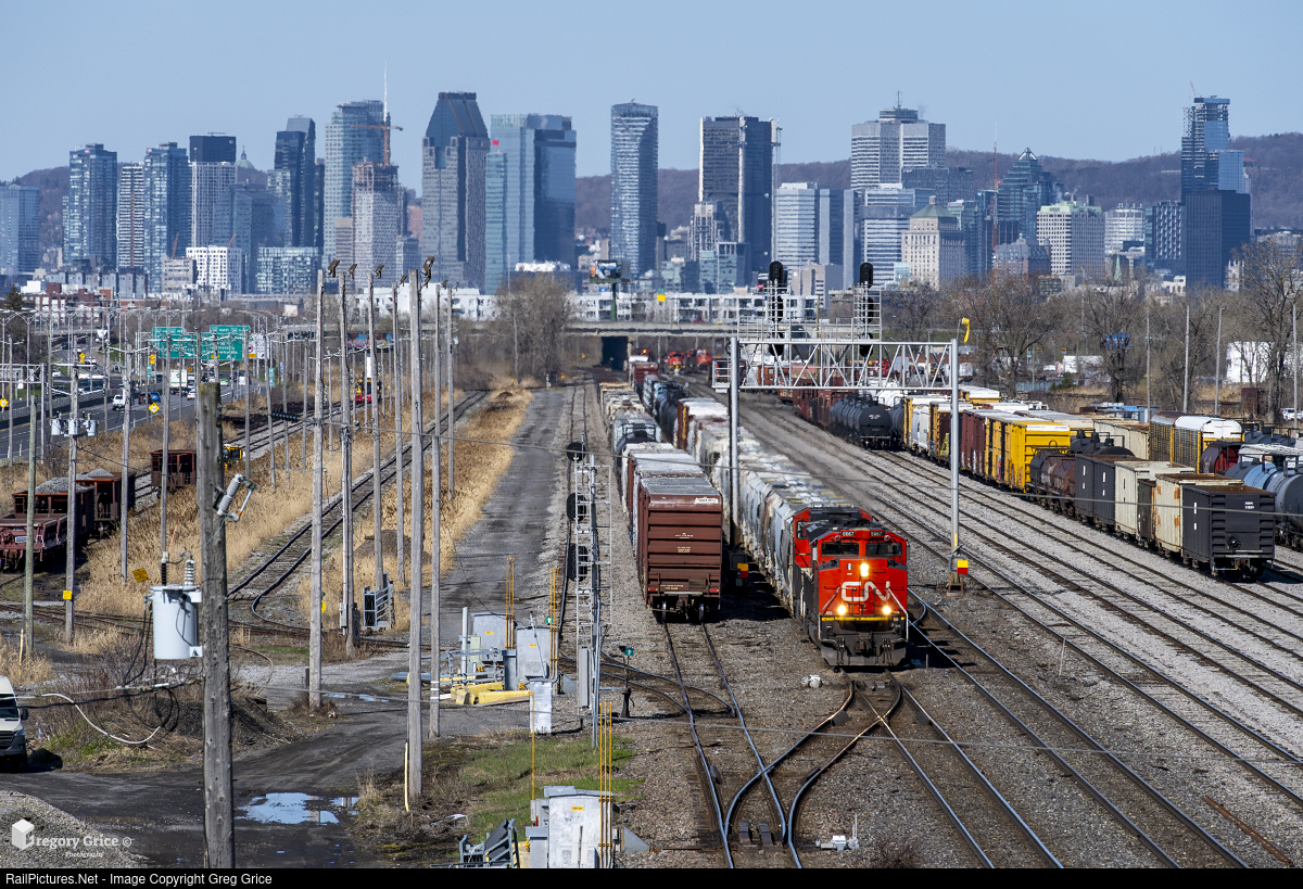 On April, 25rd, 2024, Canadian National Train 324, with EMD SD70M-2 #8867 leading, leaves the city of Montreal in the distance as it crosses off of the St-Hyacinthe Subdivision and onto the Rouses Point Subdivision at Southwark in Longueuil, QC, Canada.