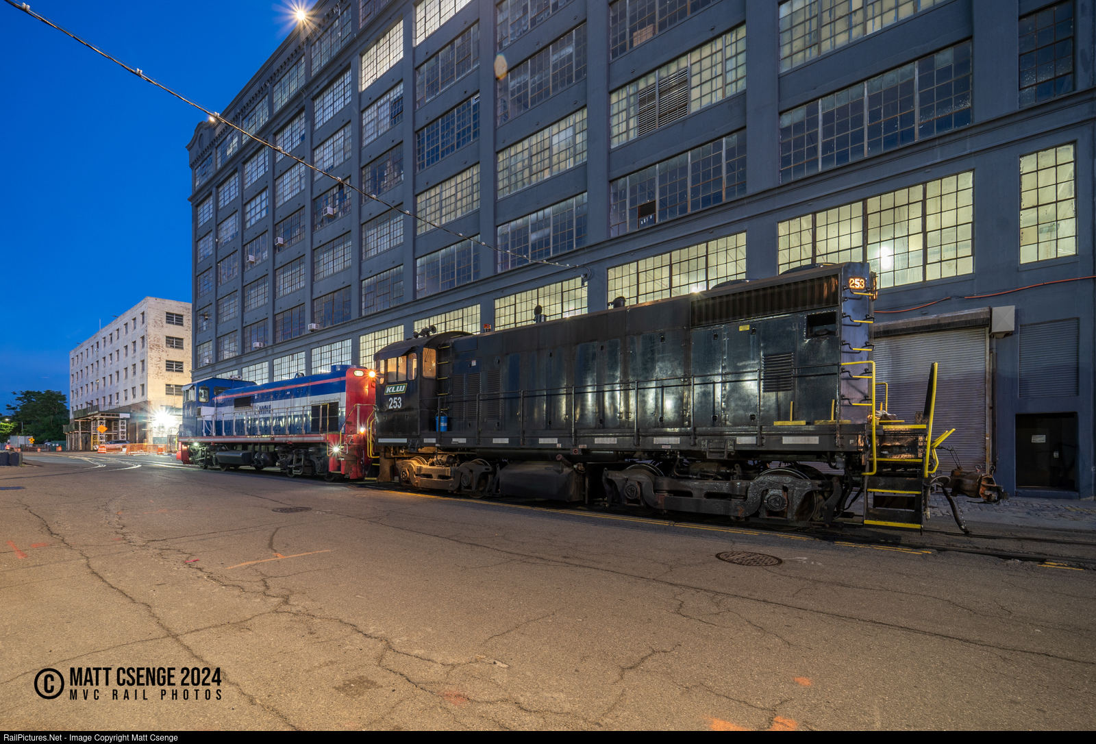 NYNJ Rail SE10B locomotive 5101 and Knoxville Locomotive Works (KLWX) 253 are seen idling on the street trackage on 1st Avenue in Sunset Park, Brooklyn in the early morning hours of June 11, 2024. No. 253 is a model TE-47-4E, originally built by the American Locomotive Company (ALCO) as a model S2 for the Manufacturer's Railway Company and modified into its current appearance by Morrison-Knudsen. |