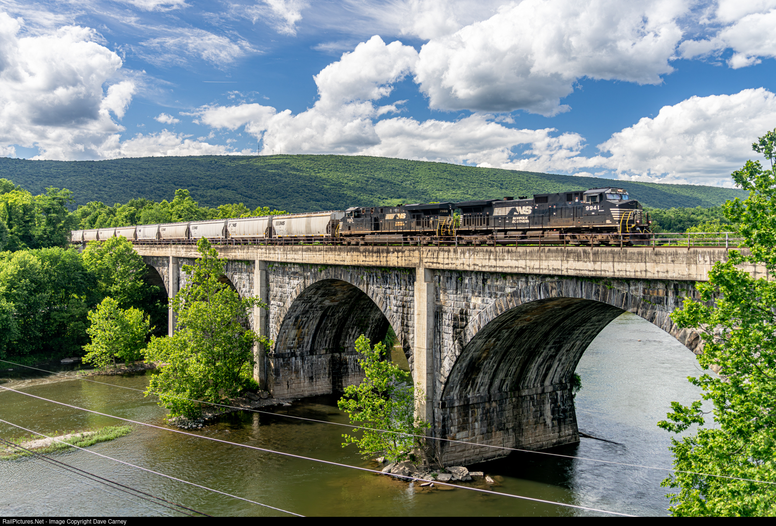 | NS 54M, a grain train made up entirely of NS covered hoppers, sails across the bridge at Mt. Union PA. |