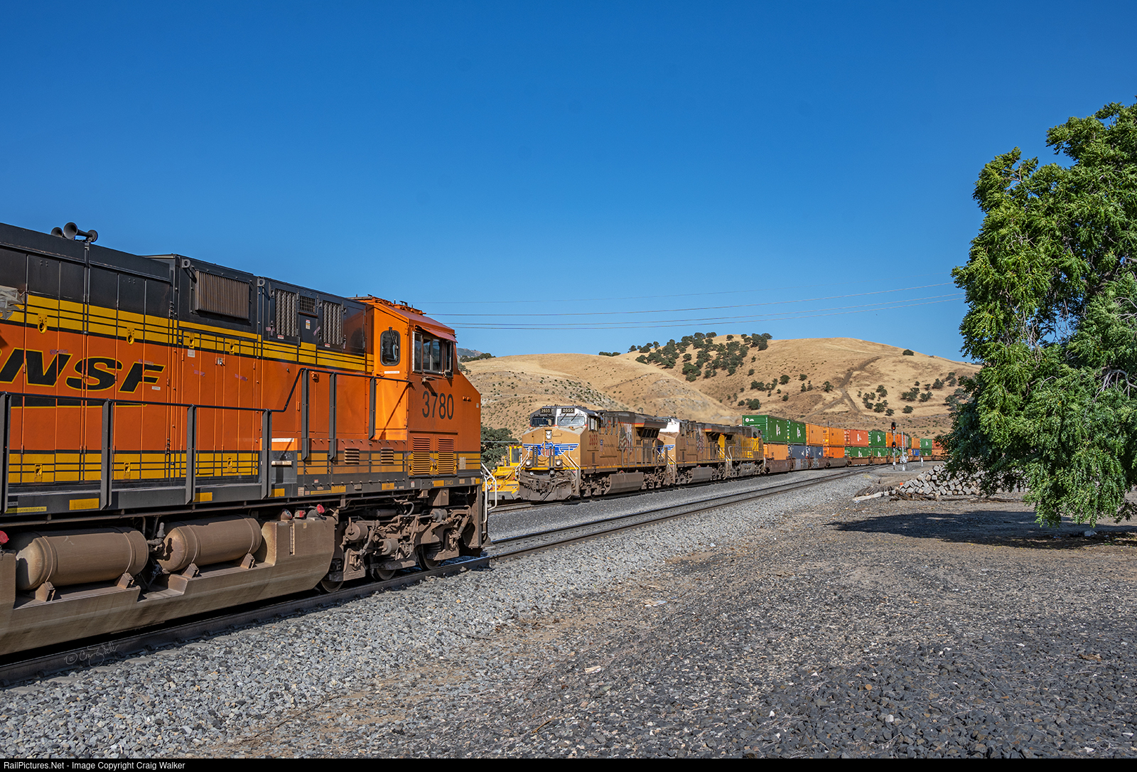 Union Pacific UPS Expedited Intermodal train ZLCLT 16 (Los Angeles to Lathrop, powered by UP ET44AC 2655, ES44AC 7713 and AC4400CW 7198) descends the grade as it passes through Bealville, in the Tehachapi Mountains. If this train had been a little longer, its rear cars would be visible on the hillside behind it, passing through the station of Cliff. Holding the mainline on UP's Mojave Sub is BNSF train H-RICBAR1-14A, a High Priority Merchandise train moving assorted freight cars from Richmond to Barstow with BNSF ET44C4 3780, Dash 9-44CW 4697, ES44DC 7249, ES44C4 7967 and ES44DC 7493 (plus, on the rear, ES44DC 7763 and ES44C4 3258) for power. The BNSF train will get moving again shortly after the UP intermodal train passes through Caliente, the next station downhill. Each of these two trains are beginning and ending their trips entirely within the state of California. (Bealville, California – June 16, 2024)