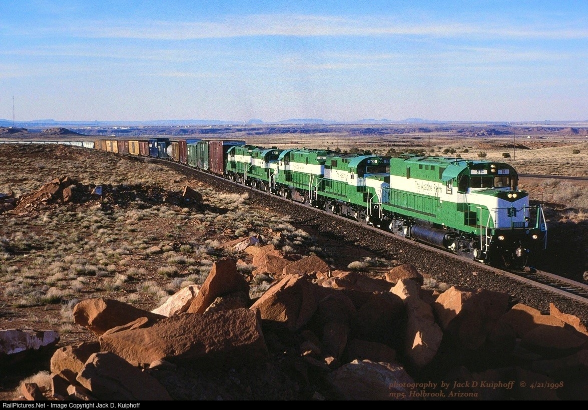 | APA, Apache Railway Alco's working hard with 81-900-82-800-83 leading a southbound up grade at mp5 out of Holbrook, Arizona. April 21, 1998. Jack D Kuiphoff © photo |