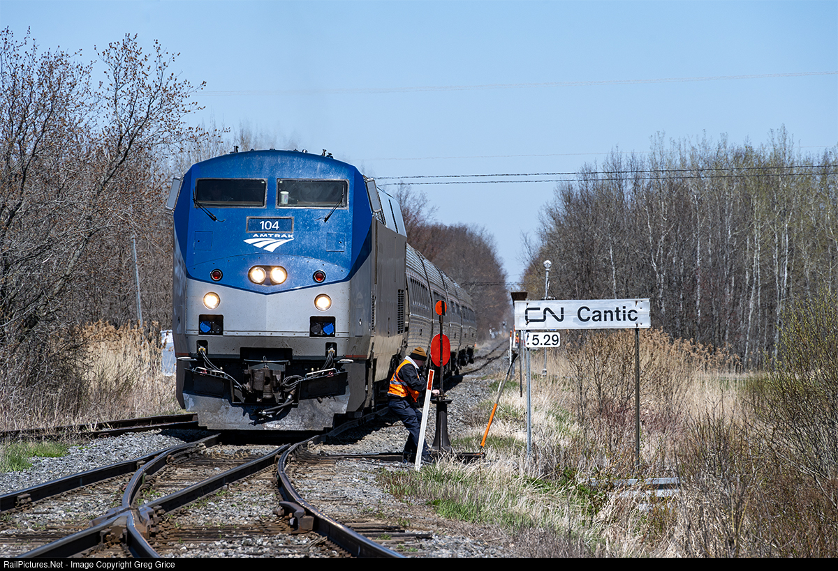 On April, 25rd, 2024, the conductor of Amtrak's southbound Adirondack (68) throws the switch at Cantic in Lacolle, QC, Canada so that the train can continue down the CN Rouses Point Subdivision towards the United States.