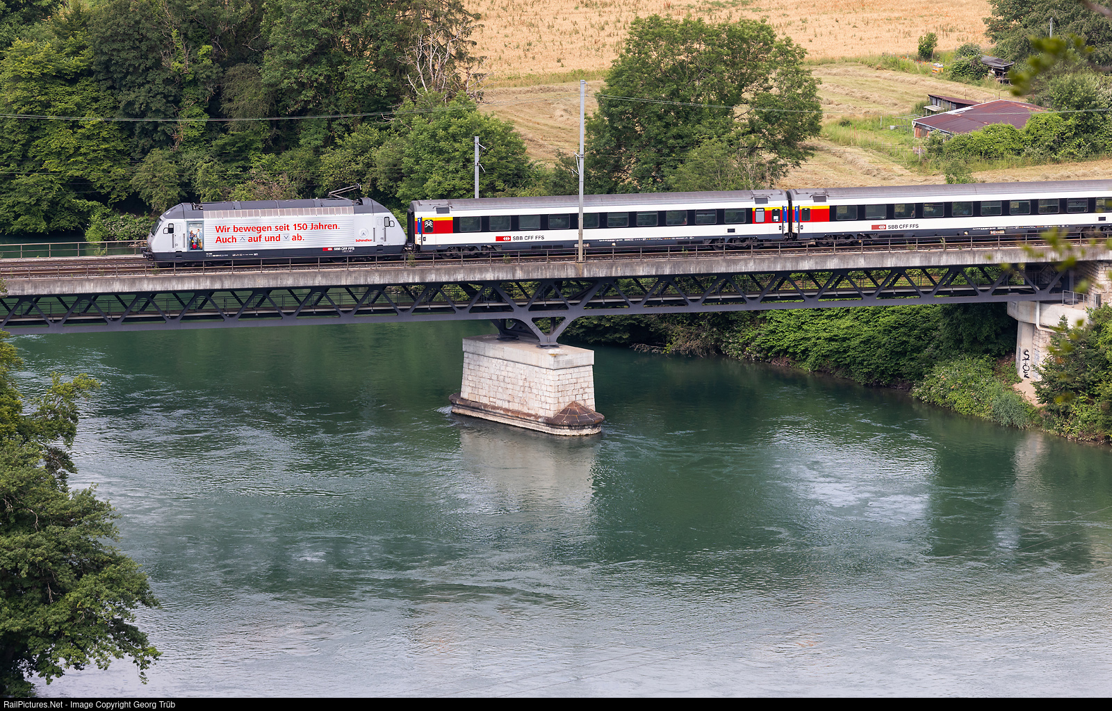 | Re 460 # 061 in the publicity paint scheme for 150 years Schindler lift, is crossing the Aare bridge between Tecknau and Olten with the IC 565 of the line IC3 from Basel via Zürich to Chur. |
