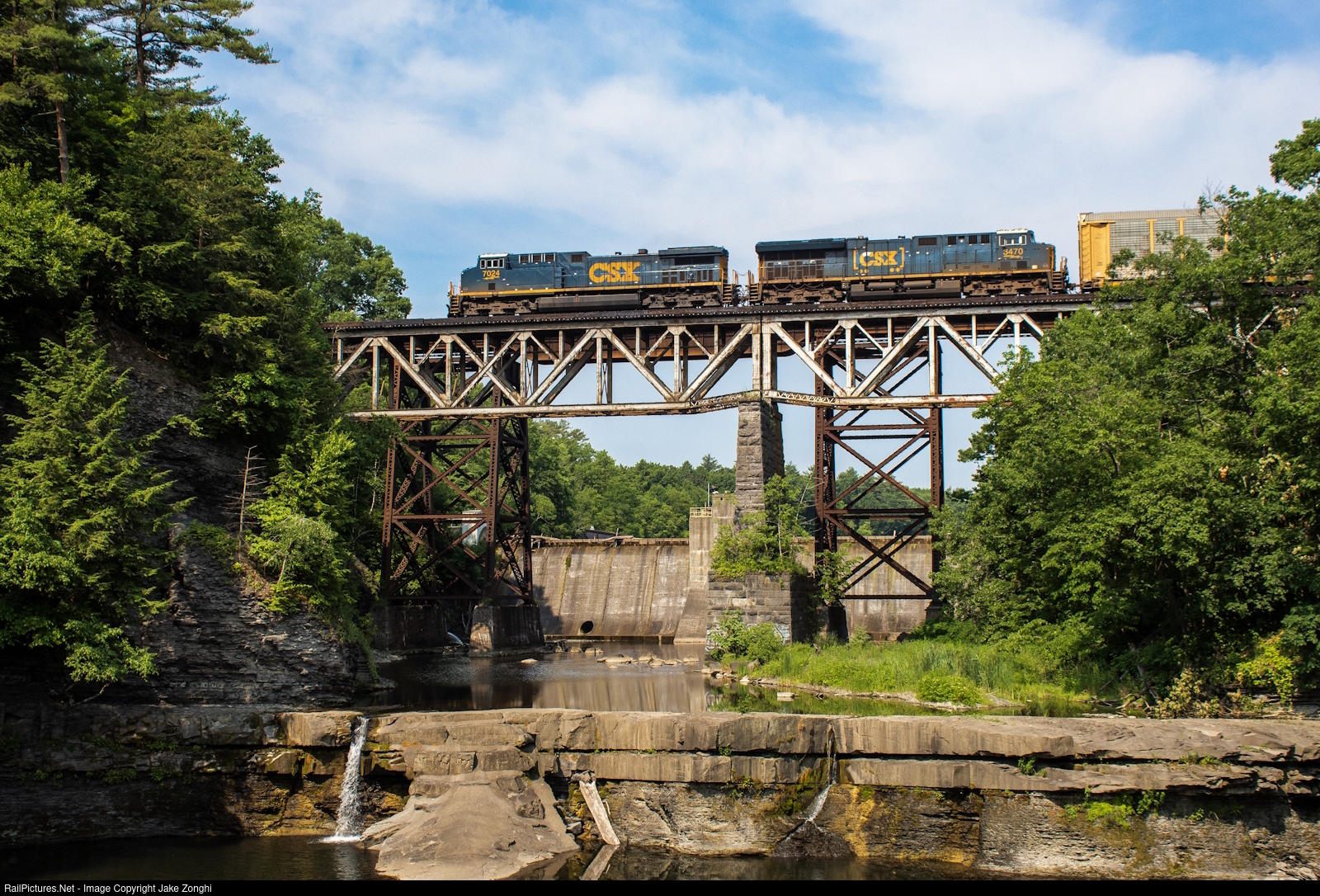 | CSXT 7024, and the CSXT 3240 both roll EB towards the busy CSX Selkirk Yard on the number 1 track after crossing from the right rail to the left rail at the Fuller Flyover just 1 mile west of here. This small waterfall splits a quaint neighborhood with just a pedestrian walkway over the falls, the Watervliet Reservoir and Normals Kill both meet here at the locks holding back the stream to just a trickle. |