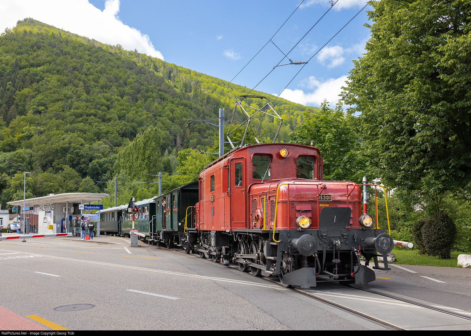 The Oensingen-Balsthal Railway (OeBB) celebrated its 125th anniversary on the weekend of June 15/16, 2024. On this occasion, several special trains free for the public circulated between Balsthal and Oensingen and vice versa. The "Seetal Crocodile" De 6/6 # 15301 of the Oensingen-Balsthal-Bahn Historic, nowadays based in Hochdorf, is running through Thalbrücke stop with a train from Oensingen to Balsthal. The locomotive was built in 1926 for the Seethal line Lucerne-Lenzburg-Wildegg of the SBB.
