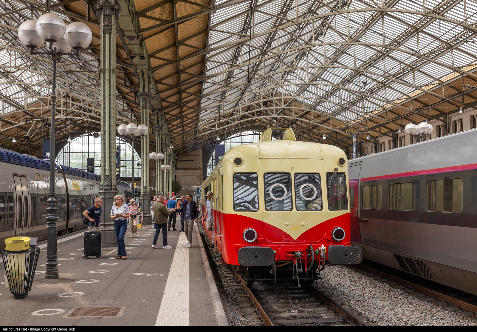 | The diesel railcar X # 2403 of the Chemns de fer de la Haute Auvergne Association (CFHA) arrived in Tours on the round trip through the Périgord and to the Atlantic coast for the Swiss organizer Servrail. |