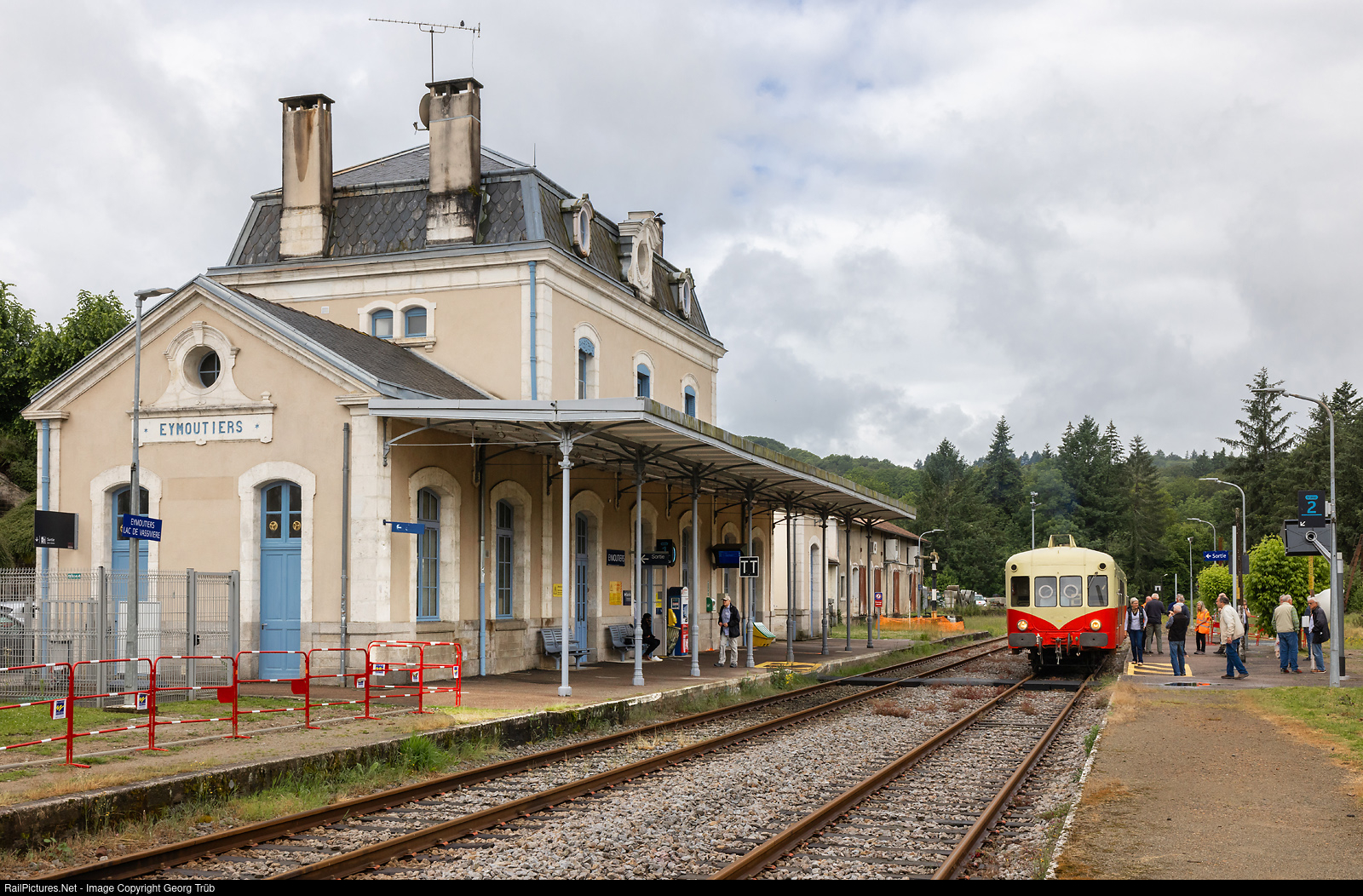 | On the last day of the round trip through the Périgord and to the Atlantic coast of the Swiss tour operator Servrail, the diesel railcar X # 2403 of the association Chemins de fer de la Haute Auvergne (CFHA) has reached the station of Eymoutiers, between Limoges and Meymac. The station dates from 1880 when the line was opened. |